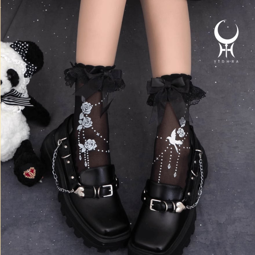 現品即納 ロリィタソックス ブラック 薔薇 リボン ゴスロリ