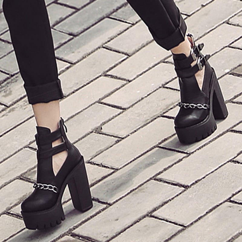 現品即納 闇を纏う 2連バックル&チェーン 極太ヒール 厚底ブーティ 24.0cm