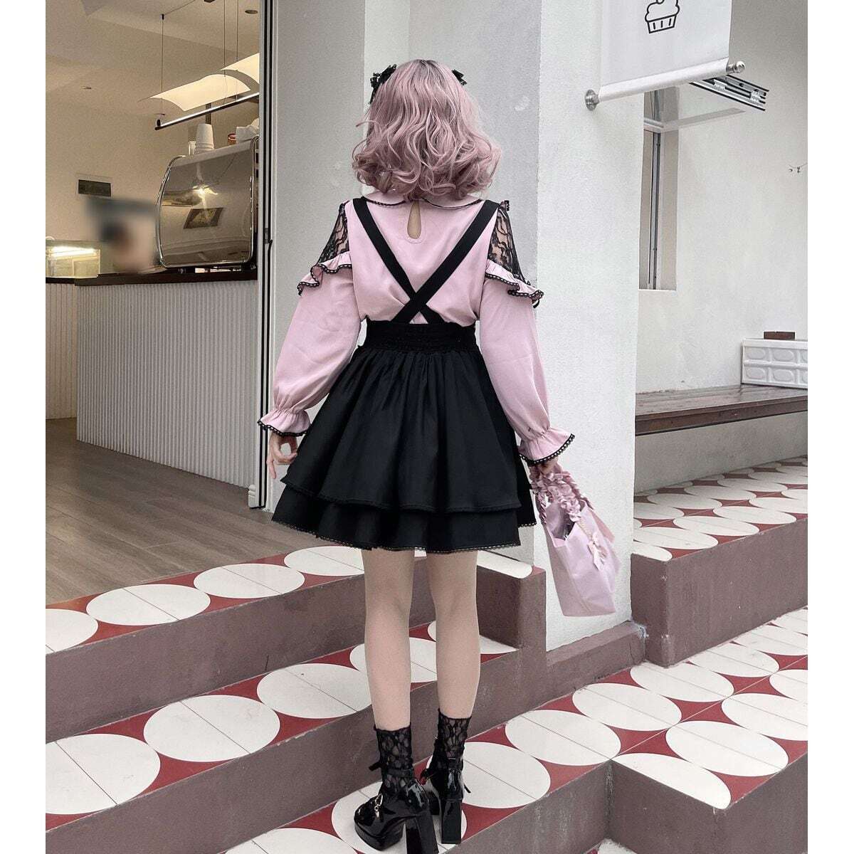 どんなブラウスとも相性抜群 画像のピンクブラウスはもちろん、白や黒のブラウス、カットソーなど、どんなトップスとも合わせやすい万能アイテム。肩紐は長さの調節が可能なので、身長に合わせてジャストサイズで着用できます。これ一枚で、完璧な地雷系・量産型スタイルが完成します!