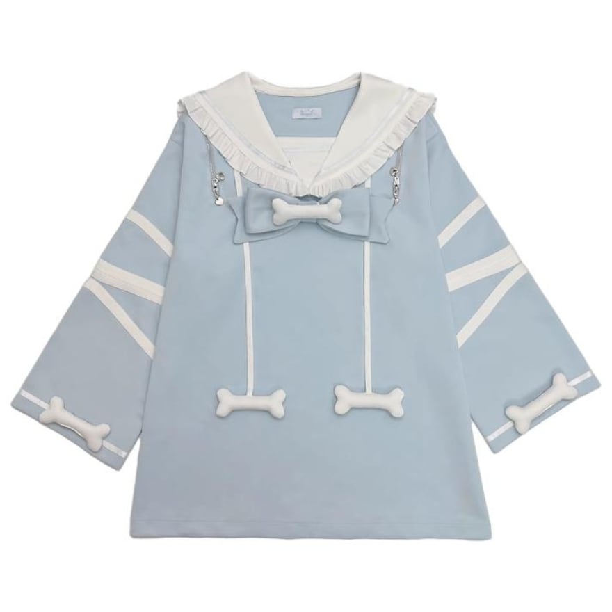 骨(ボーン)モチーフで魅せる 胸元の大きなリボンと、裾、袖口にあしらわれた**骨(ボーン)**モチーフが目を引くデザイン。遊び心とダークな雰囲気を両立した、地雷系・サブカル系ファッションにマストなアイテムです。