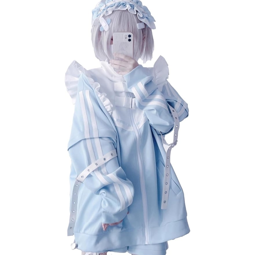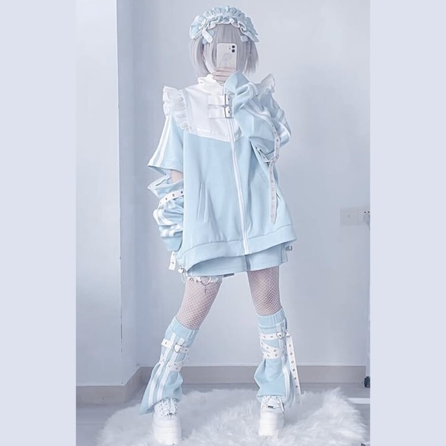 水色と白のバイカラーデザインの個性的なサイバーパンク(ジャケット、ハーフパンツ、レッグウォーマー)の3点セットアップです。がセットになっています。