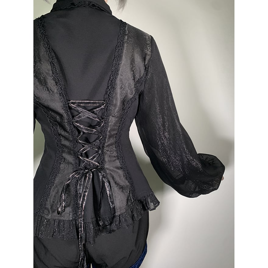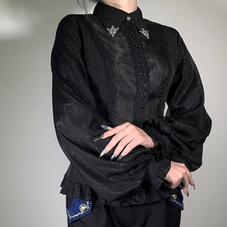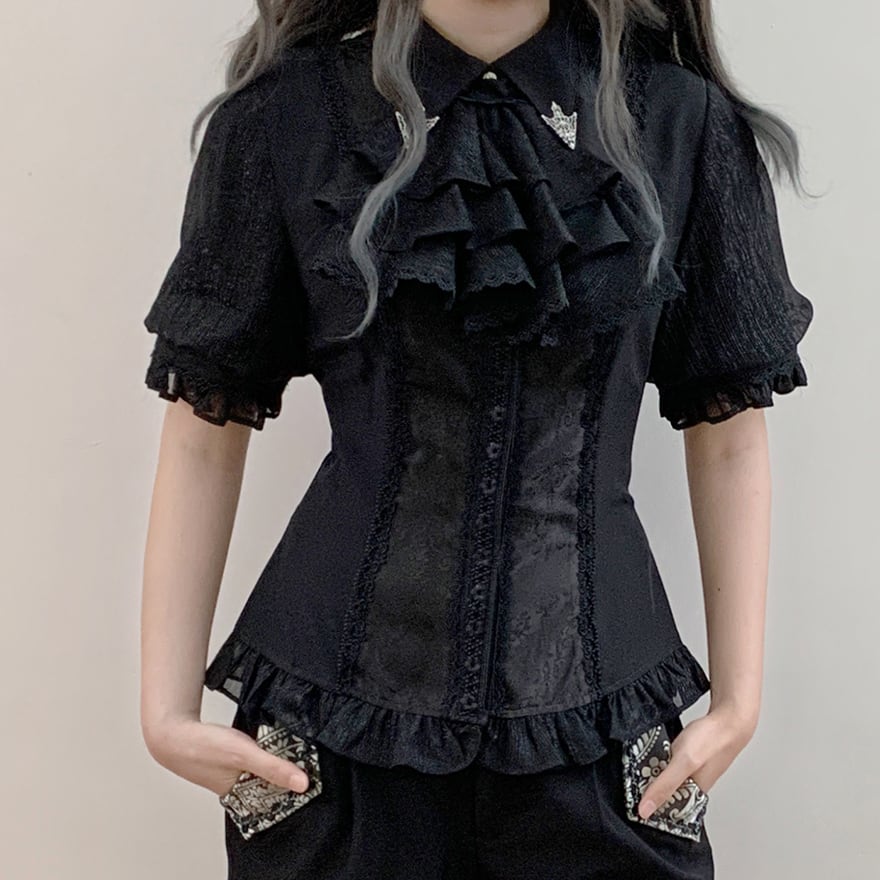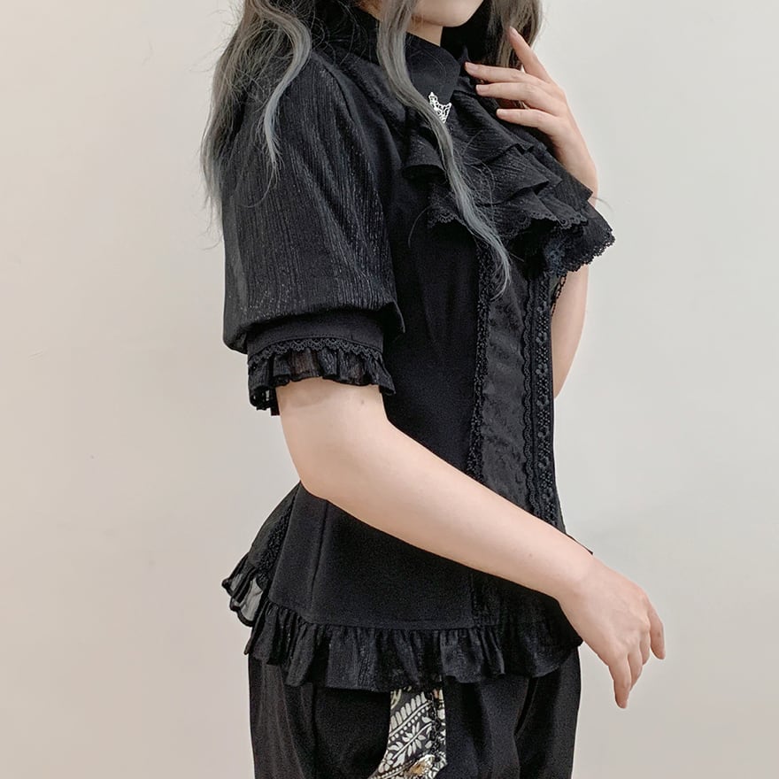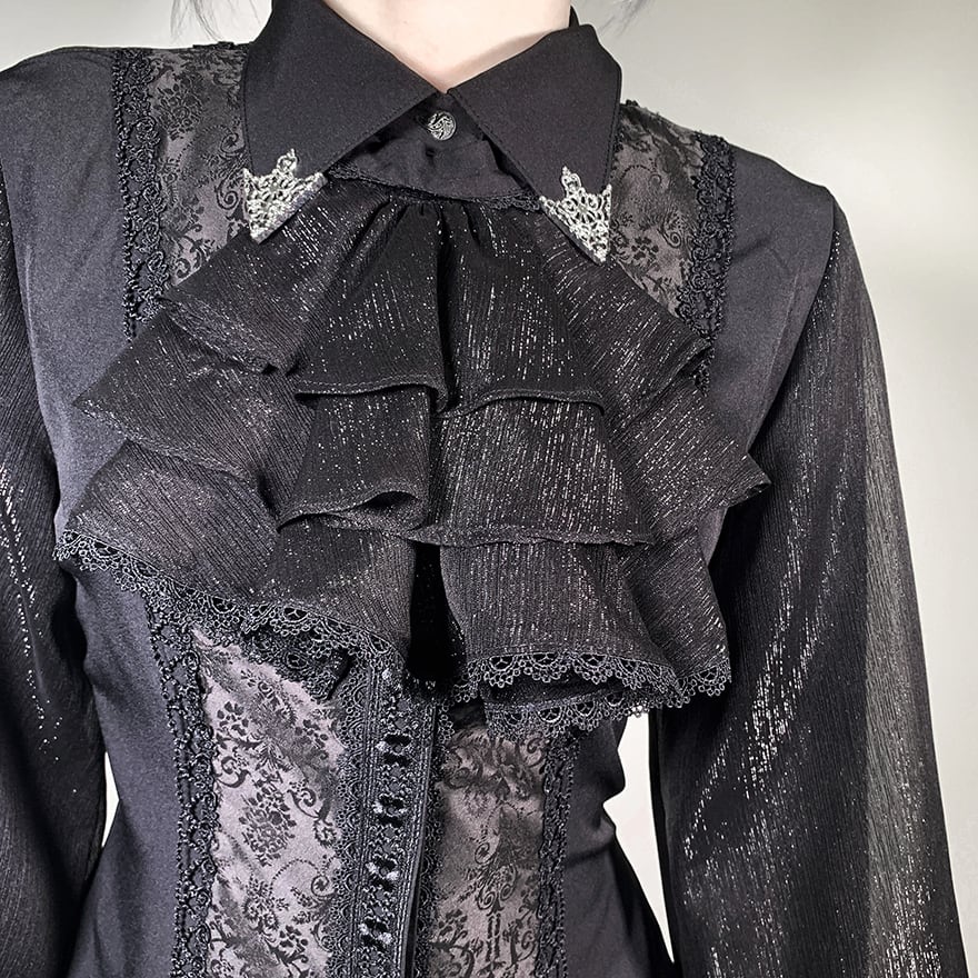 胸元を飾る幾重にも重なったフリルと、繊細なレースが目を引くゴシック系のブラウスです。