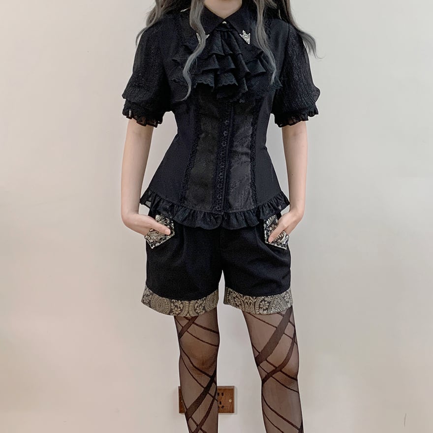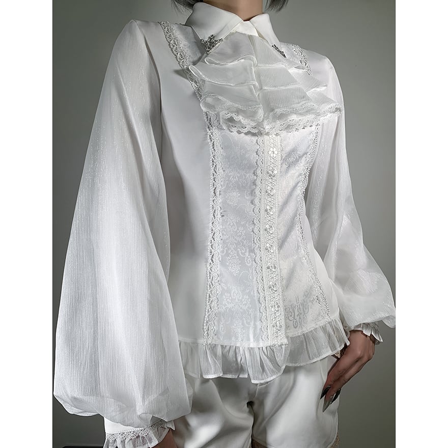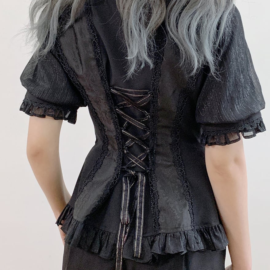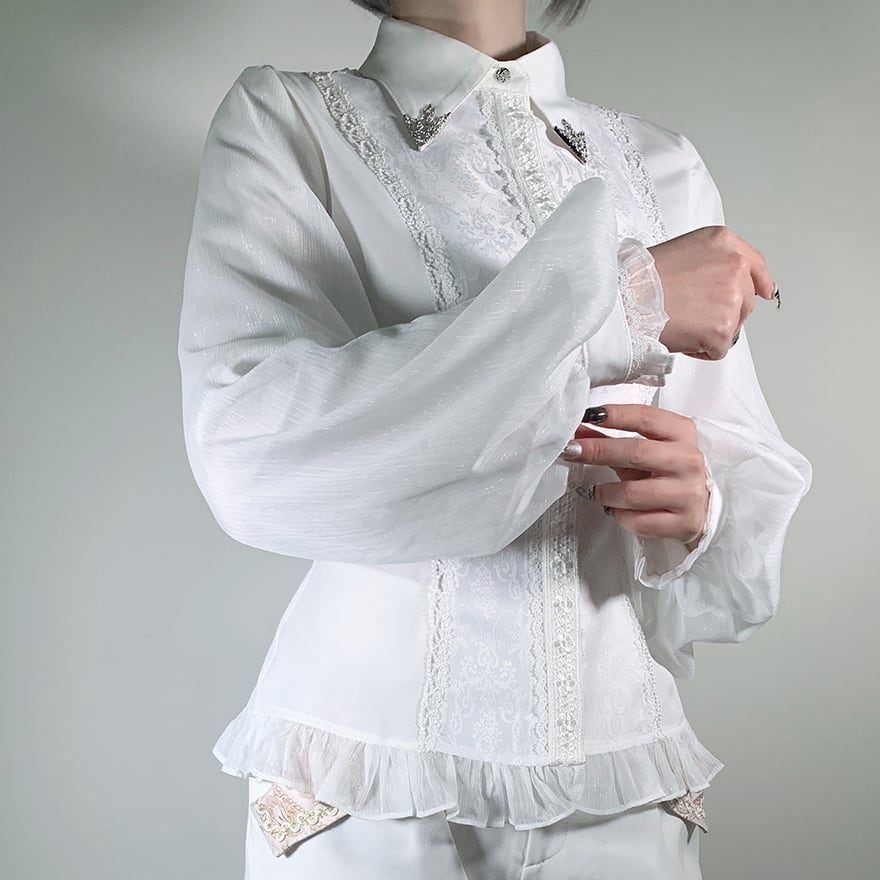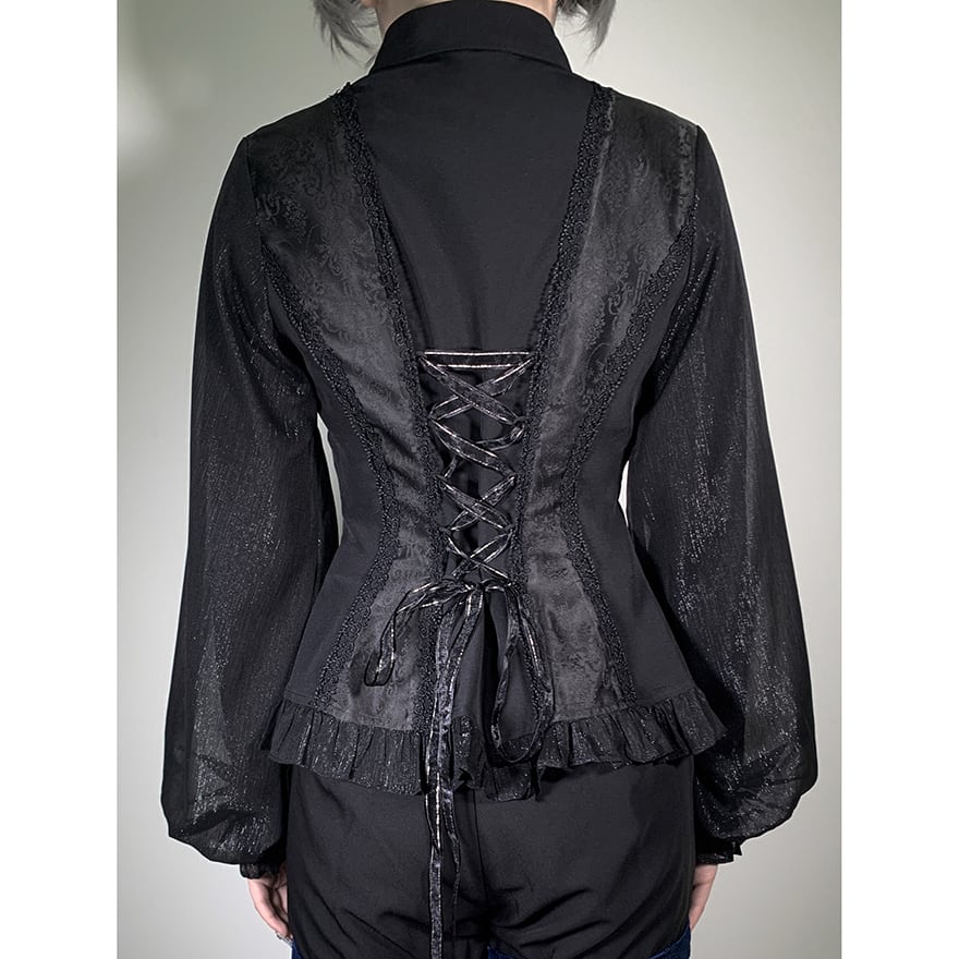 胸元を飾る幾重にも重なったフリルと、繊細なレースが目を引くゴシック系のブラウスです。