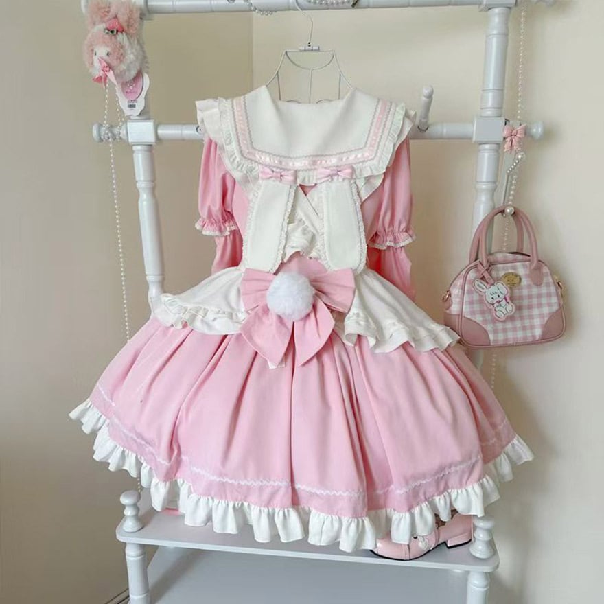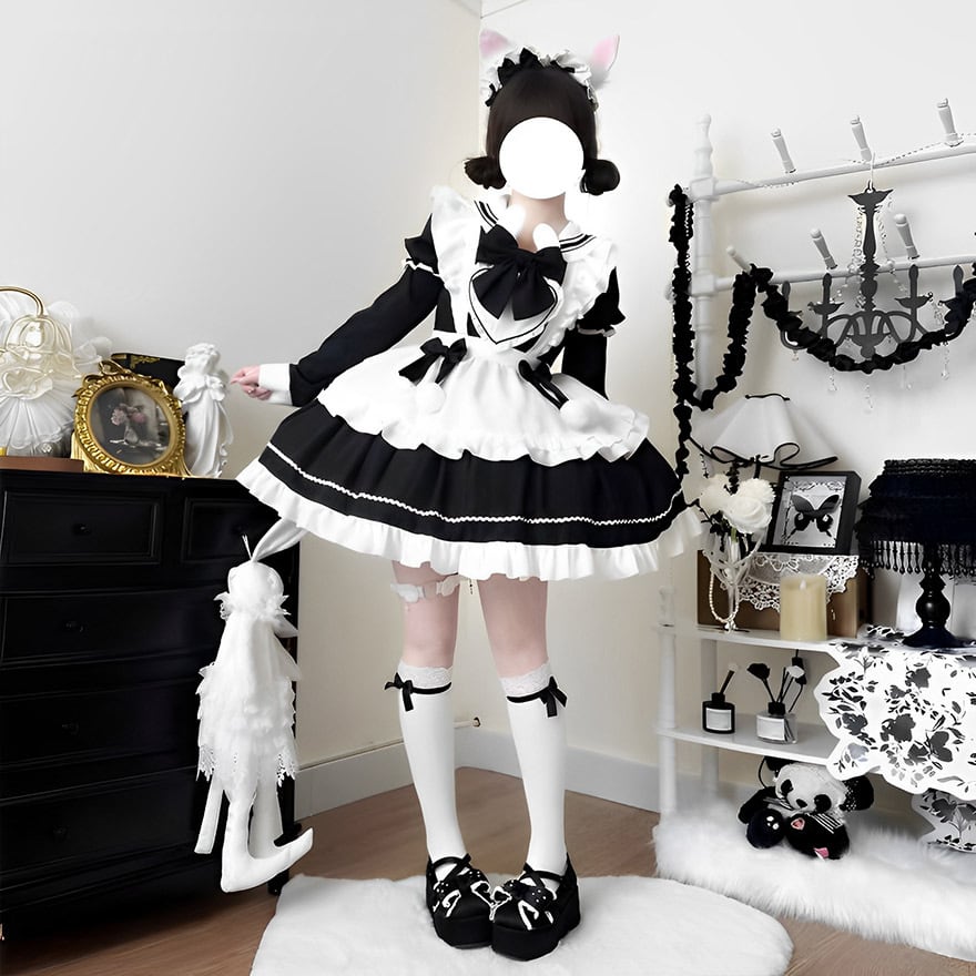お袖や裾のフリルが、女の子らしいシルエットを演出します。セーラー襟とエプロンは取り外しも可能で、気分に合わせた着こなしが楽しめます。