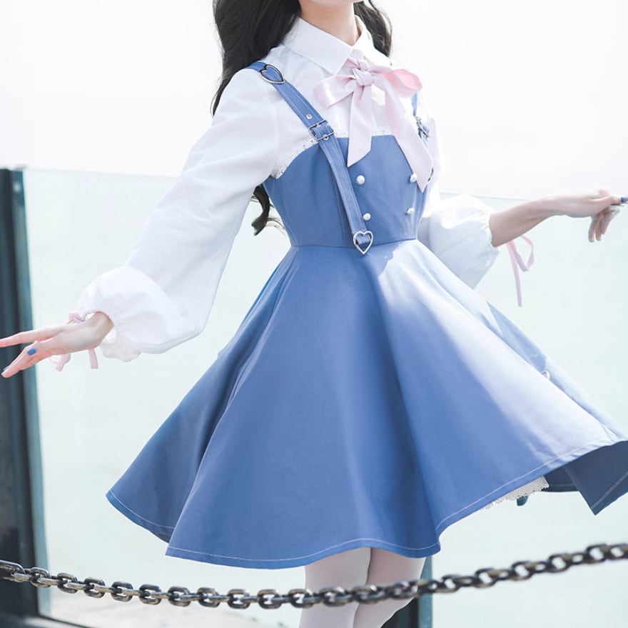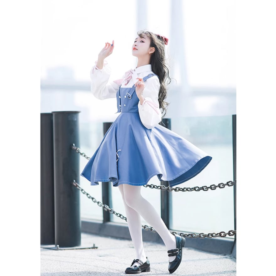ふわっと広がるフレアジャンパースカートとブラウスのセットアップです。