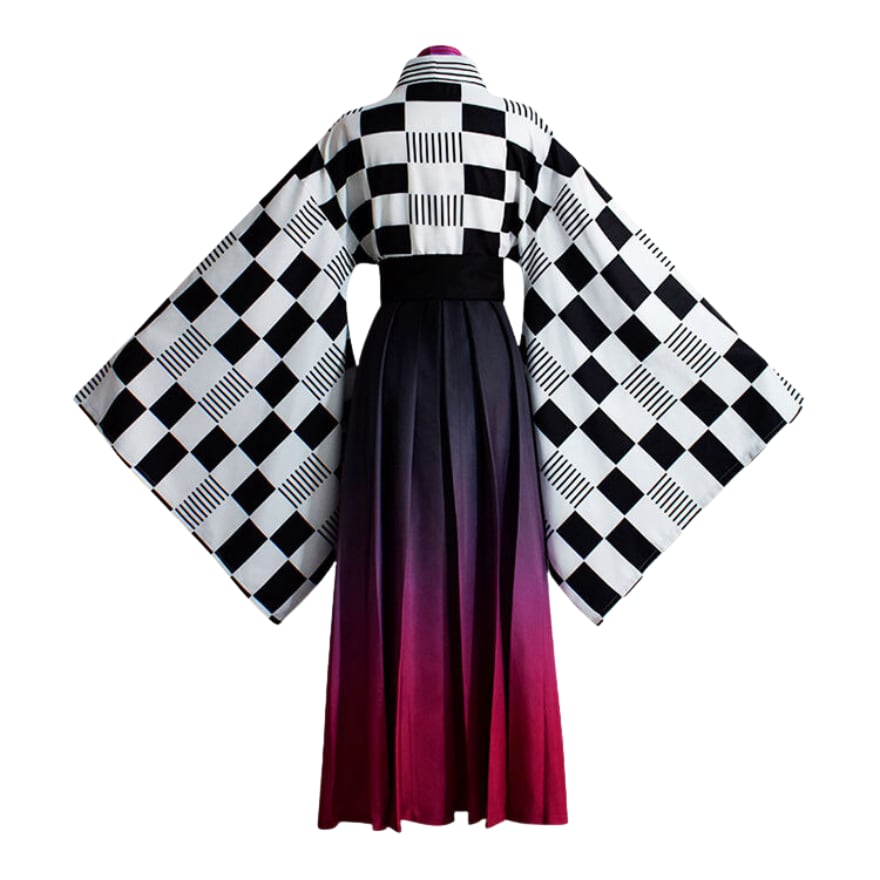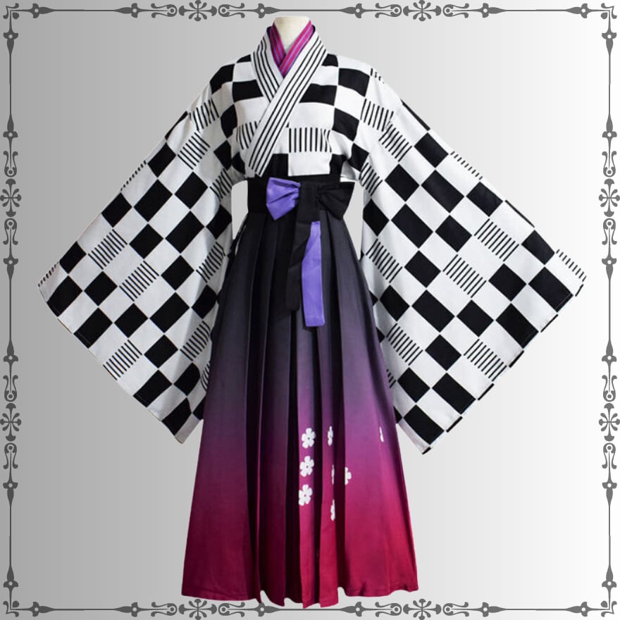 クラシカルな市松模様の着物上着にパープルのグラデーションが高見えするプリーツスカートの上下セットです。