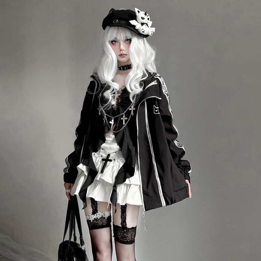安全ピンやチェーンなどのパンキッシュな装飾が、ダークでクールな雰囲気を演出。サイドには、翼の生えたキュートな白猫のぬいぐるみが付いており、「可愛い」と「病み」が絶妙なバランスで共存しています。