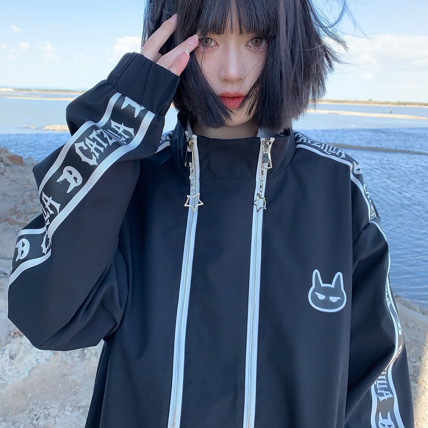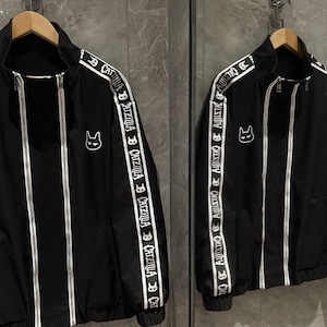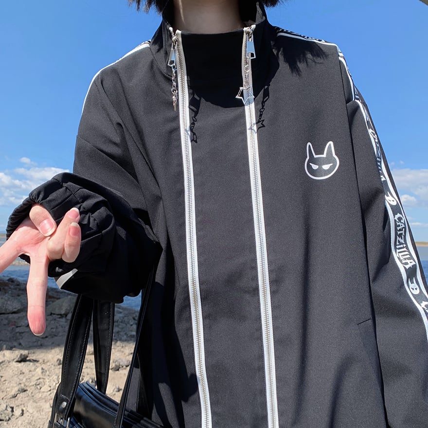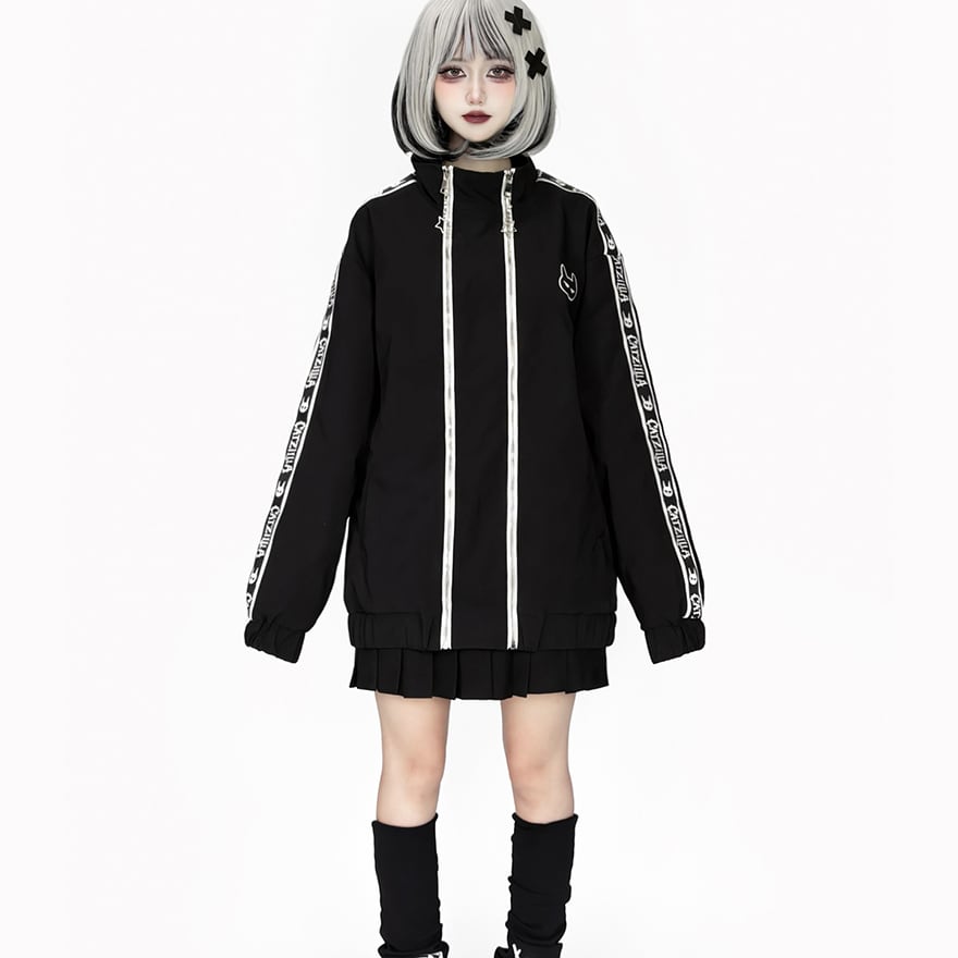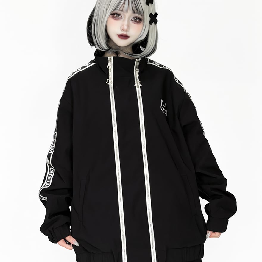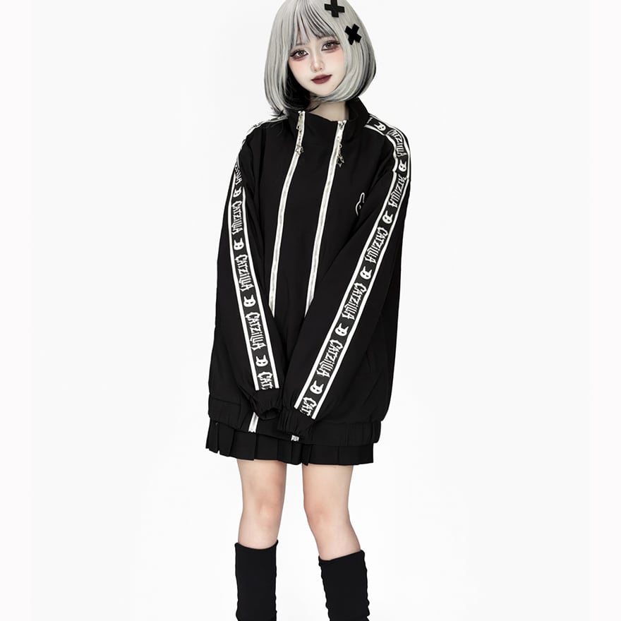 フロントを走る2本の白いジッパーが強烈なインパクトを放つ、地雷系ファッションに最適なトラックジャケットです。