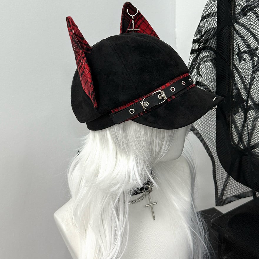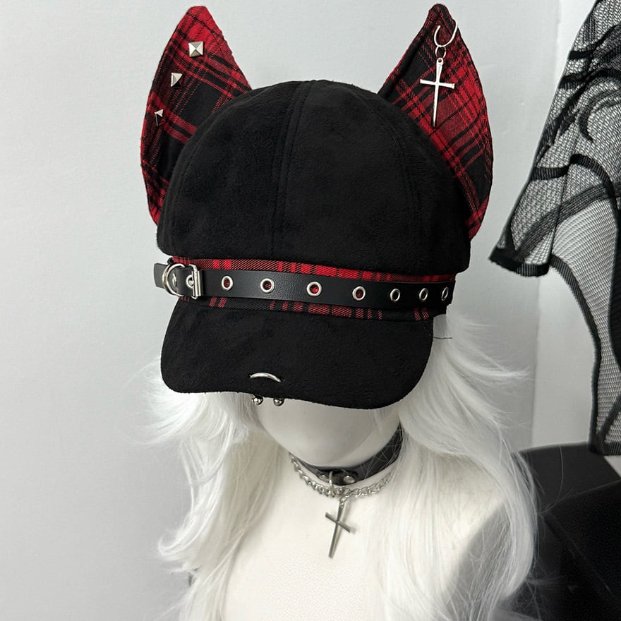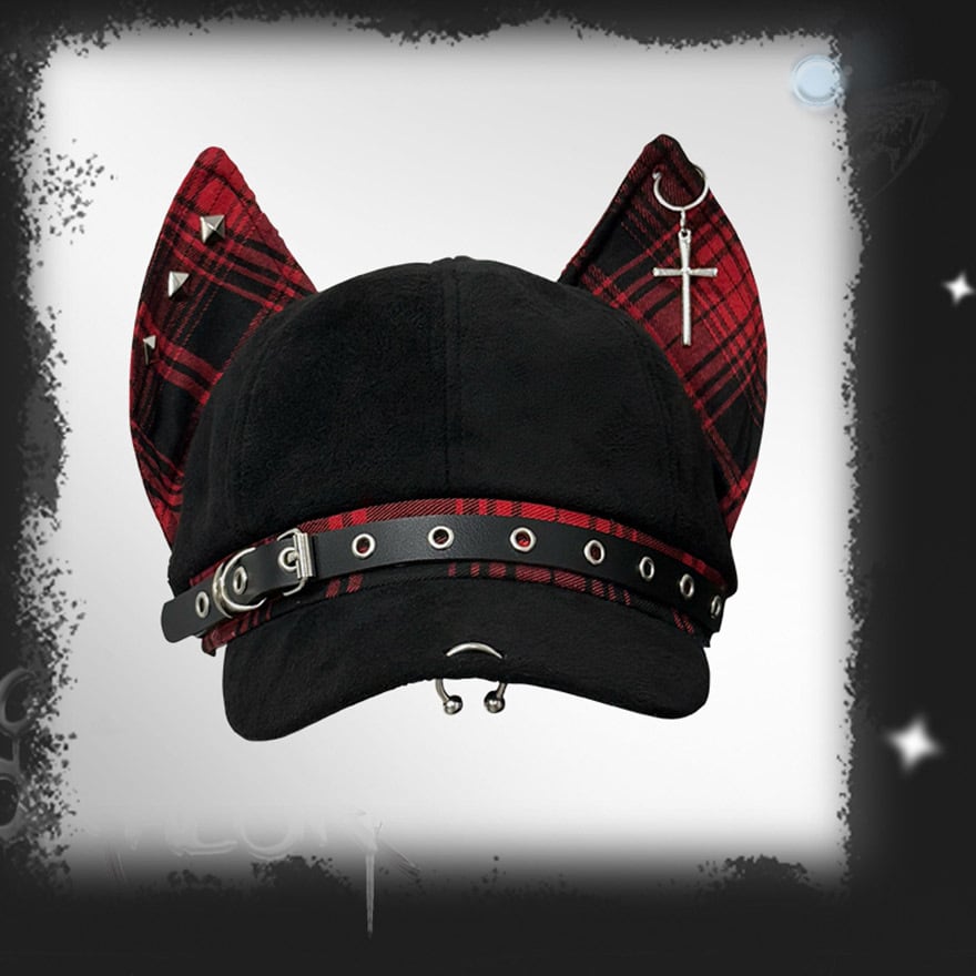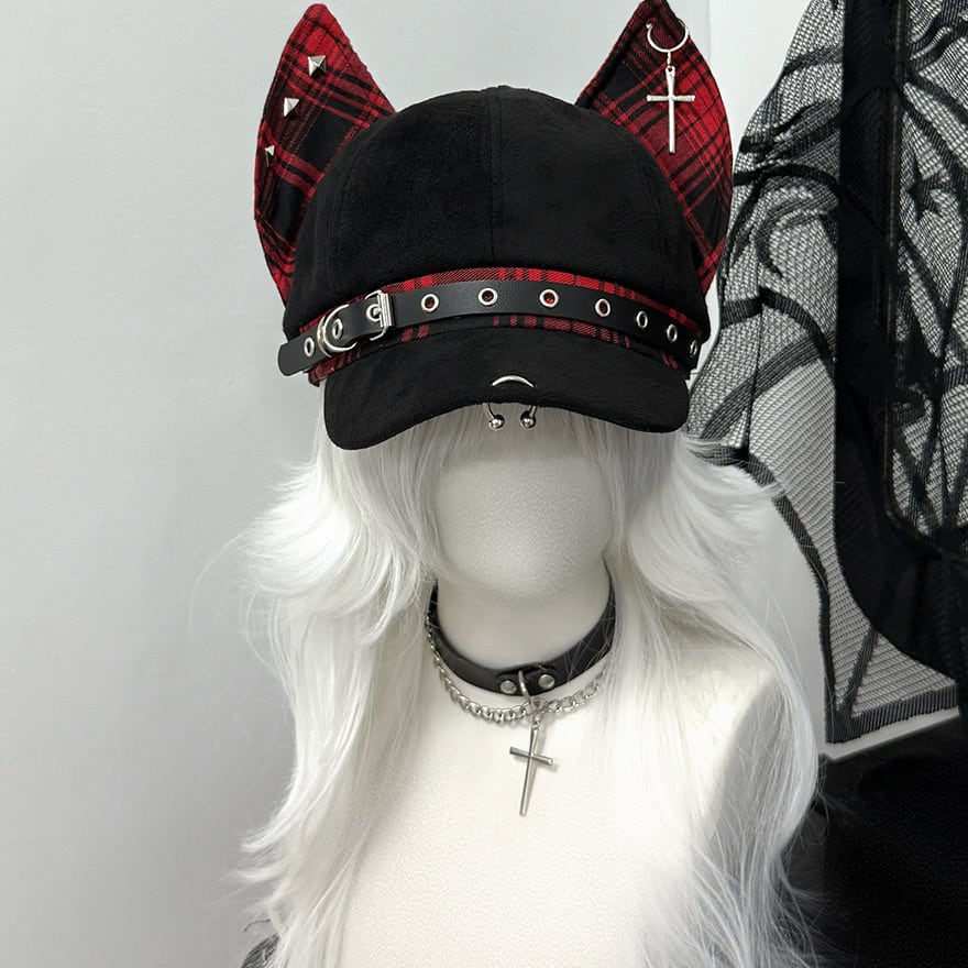 大きな猫耳がインパクト抜群のキャップです。耳とベルト部分には、パンキッシュなチェック柄が施されています。