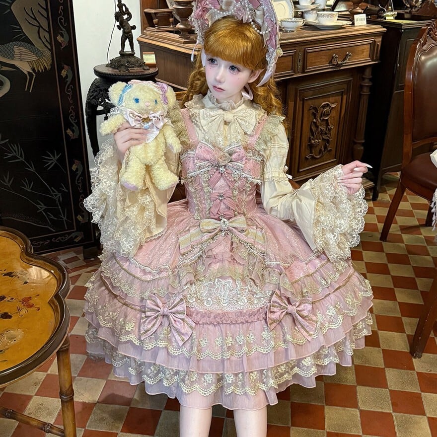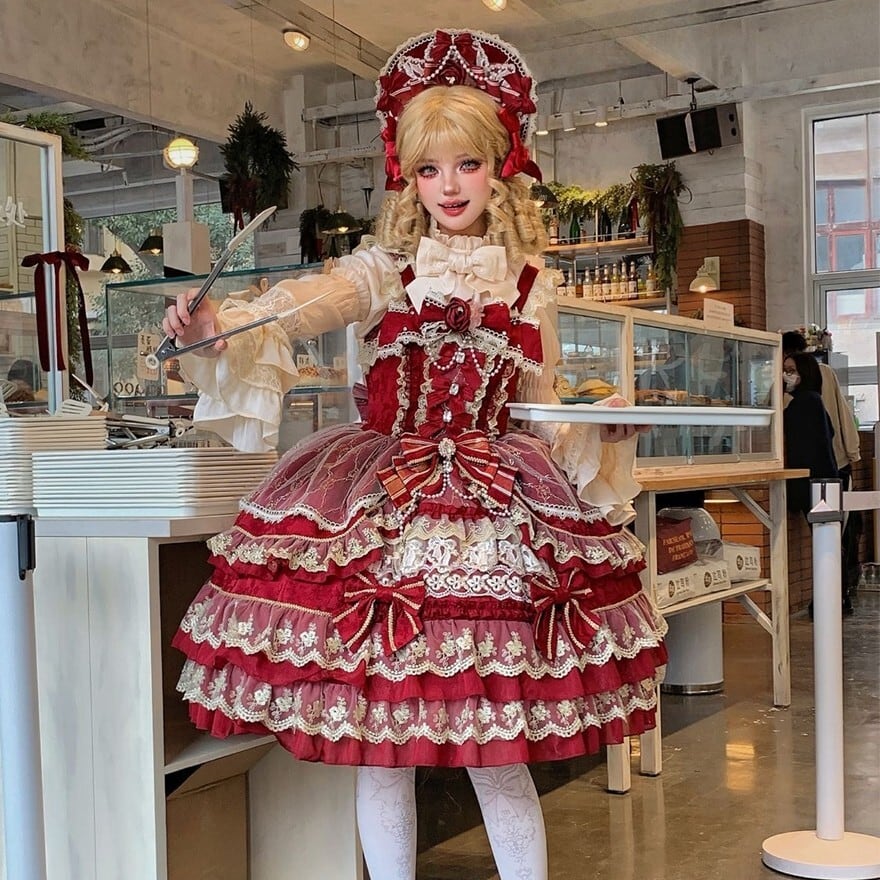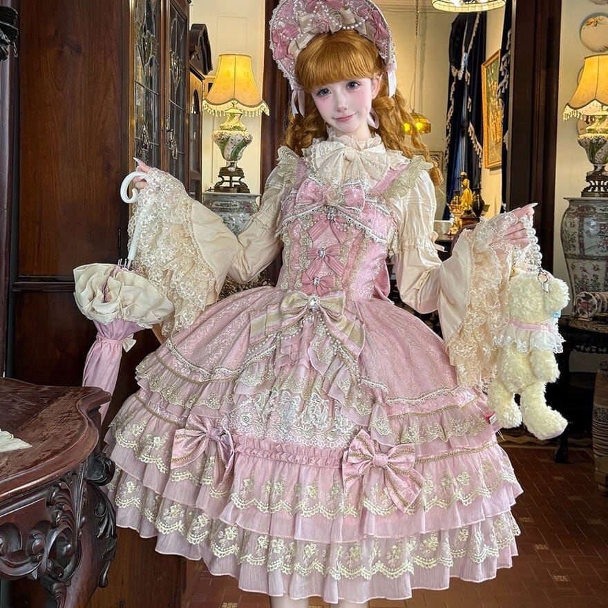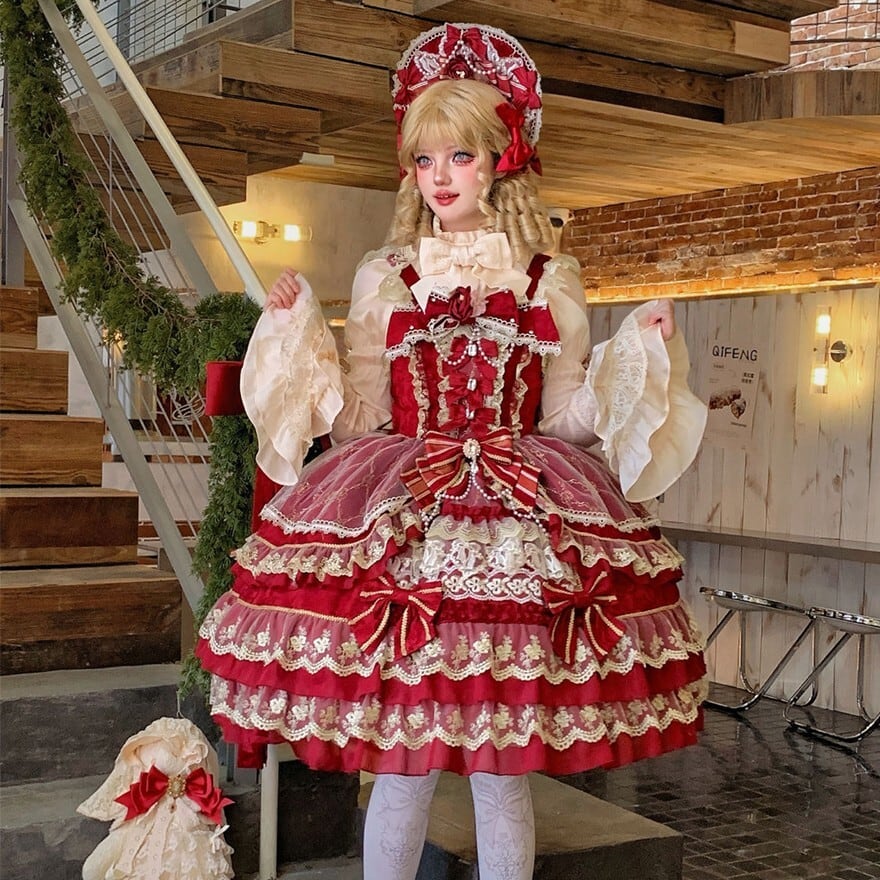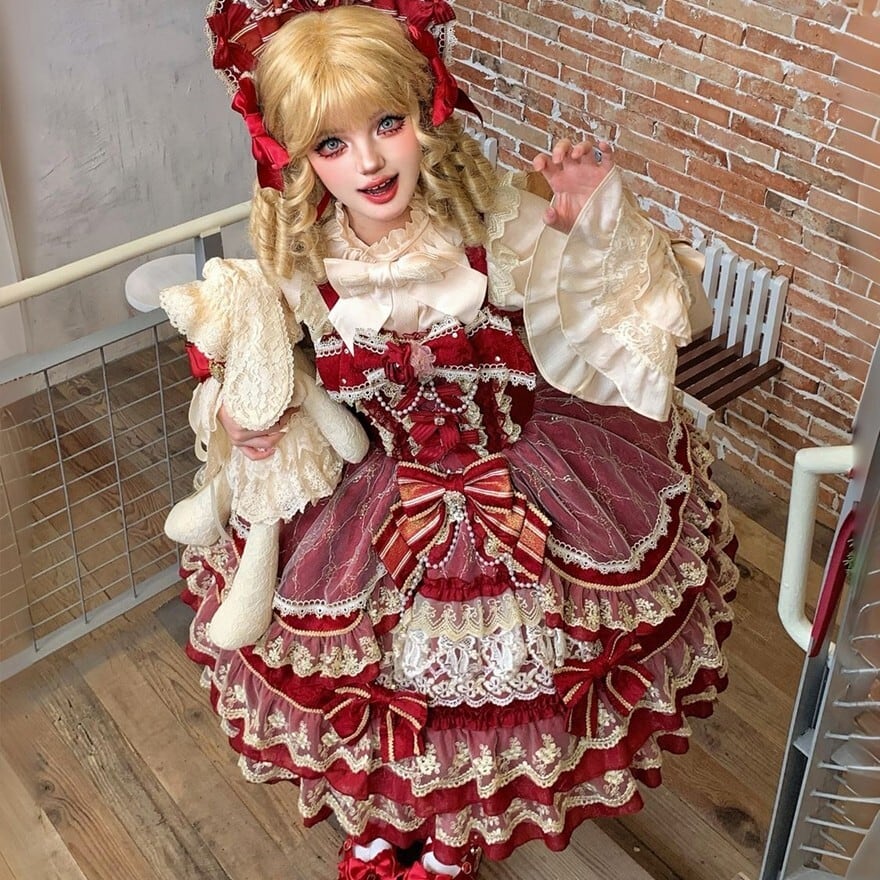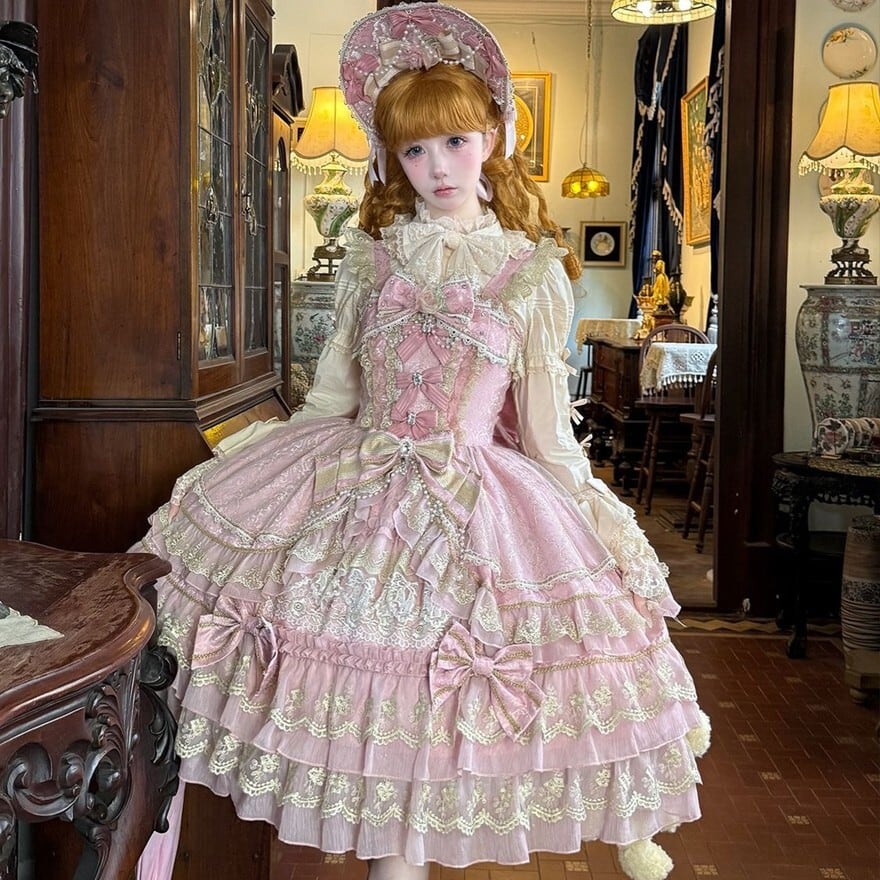 ピンク、ボルドー、ブラックの3色展開で、繊細なレースと豪華なリボンがあしらわれたクラシカルロリータドレスです。