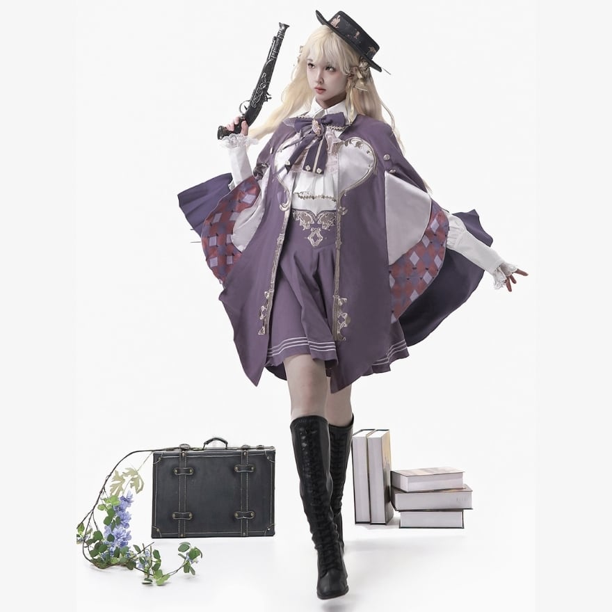 パープルを基調としたマント、白のブラウス、パープルのフレアスカートの3点セットです。