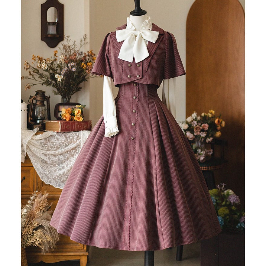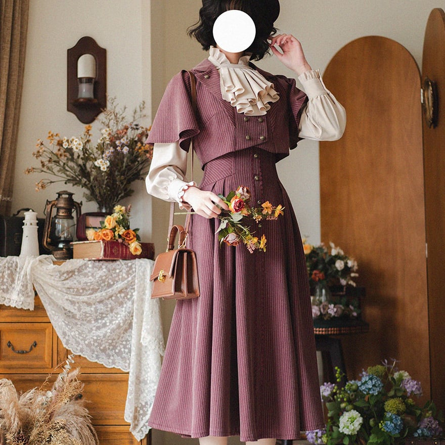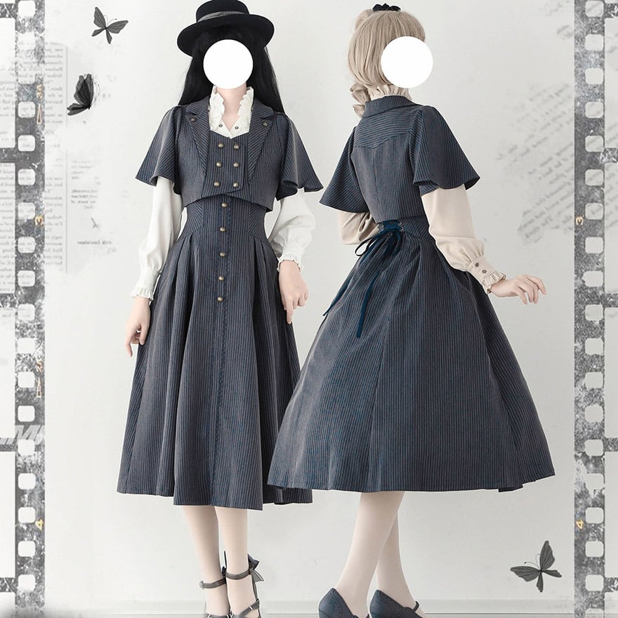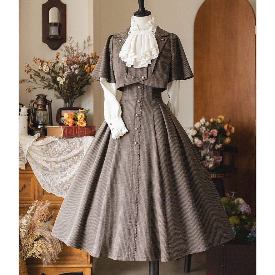 知的な印象を与えるピンストライプ柄と、フロントに並んだアンティーク調のボタンが、ヴィンテージ感を高めます。