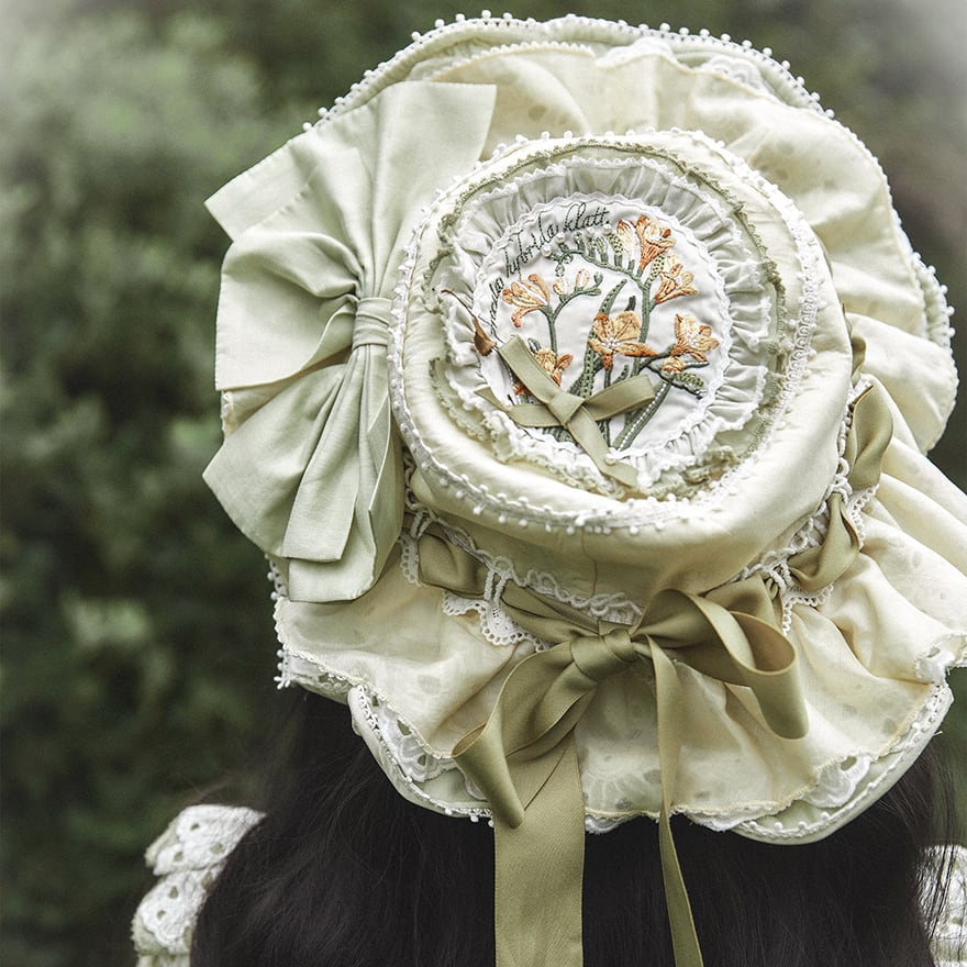 クラシカルなコーディネートを完璧に仕上げる、フリルと刺繍が美しいボンネットハットです。