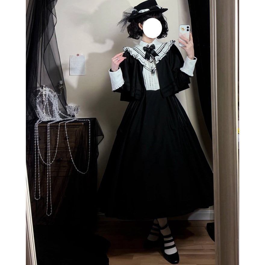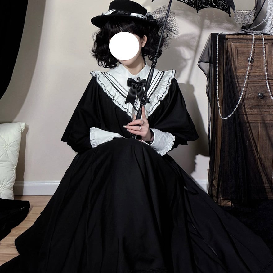 清楚な白のブラウス風ワンピースに、黒のケープを重ねた、修道女を彷彿とさせるゴシックロリータのセットアップです。