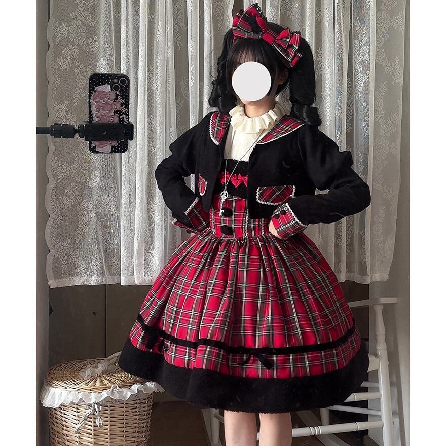 予約商品 クラロリ 3点セットアップ チェック柄 ジャケット ヘッドバンド サスペンダースカート