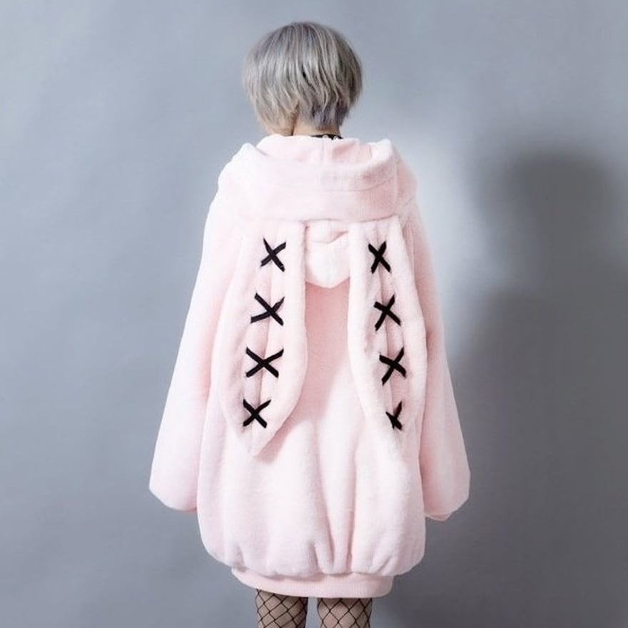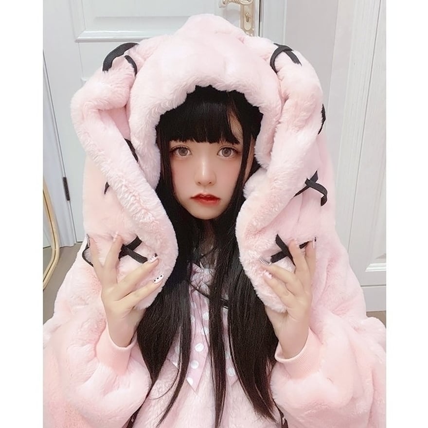 モコモコ優しい肌さわりが嬉しいウサギ耳フーディ、コートです。