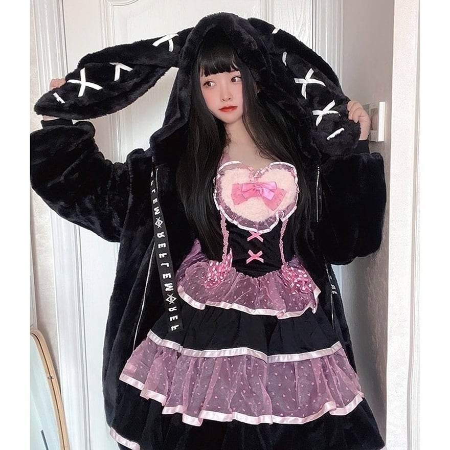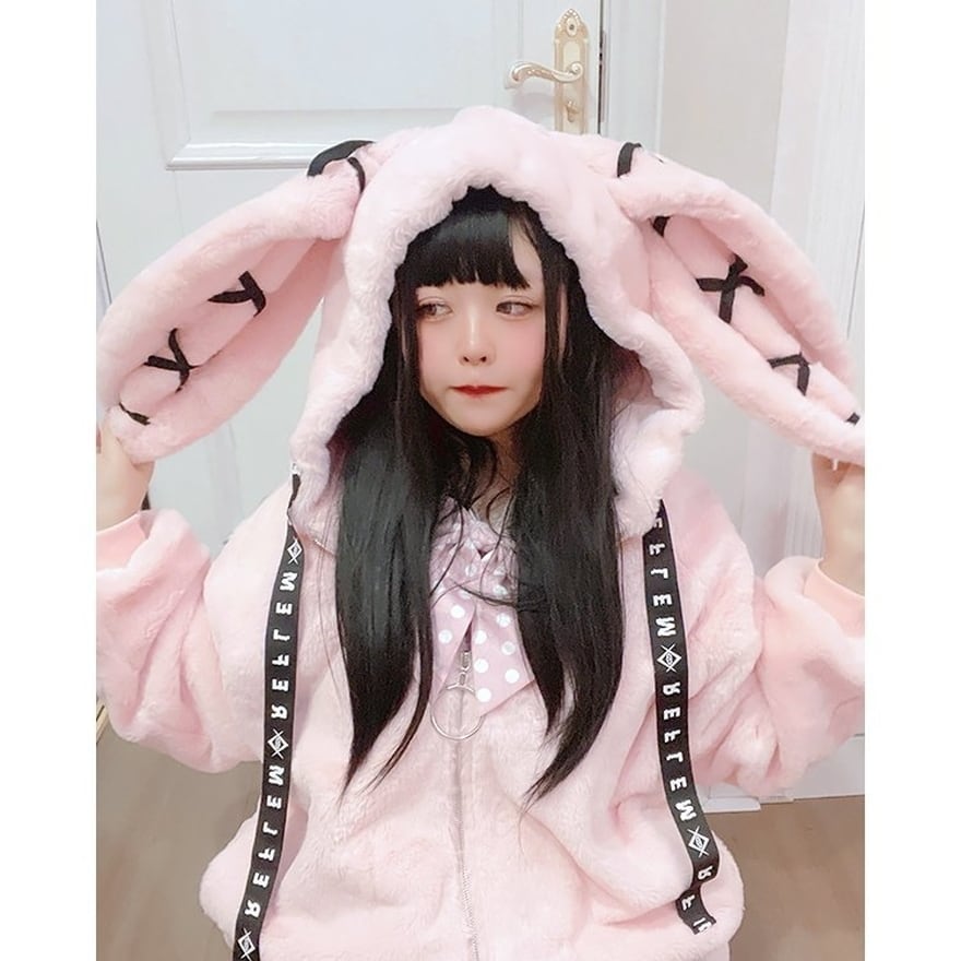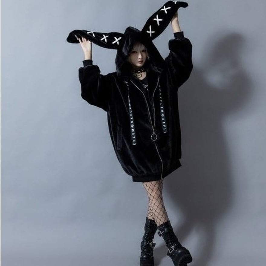 即納 ブラック ゴスロリ地雷系 モコモコ うさぎ耳フーディ ふわふわ ストリート Y2K