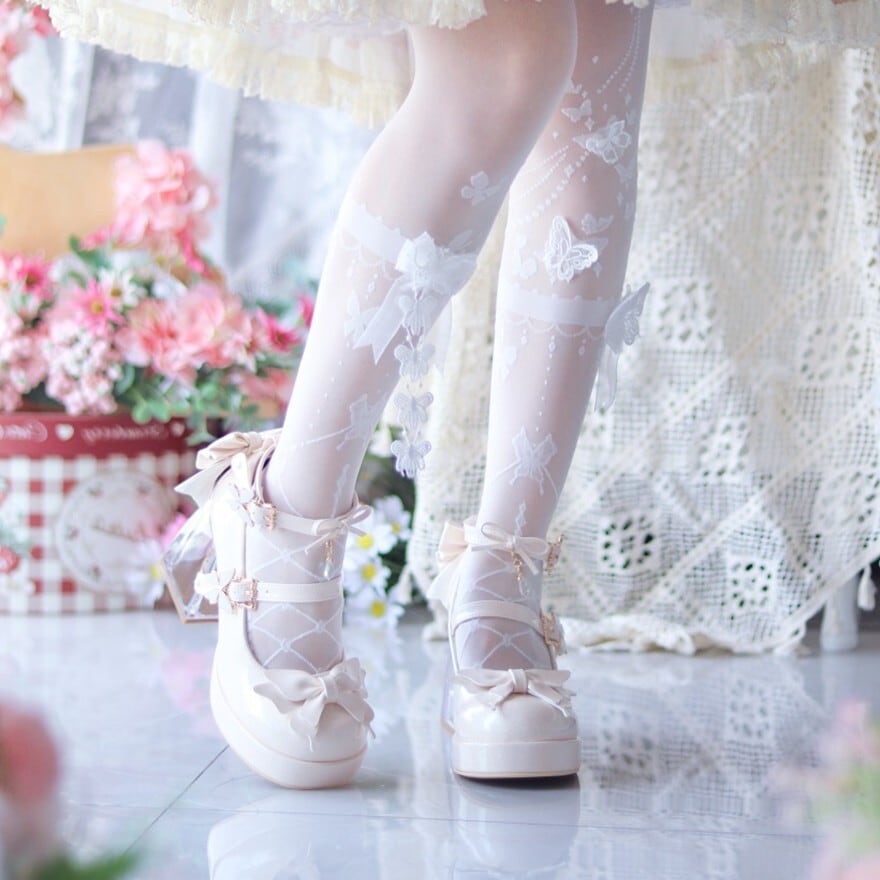 クリアヒールとリボンが、足元を軽やかに、そして特別なものにしてくれます。光を反射するたびにキラキラと輝き、お茶会やイベントで注目を集めること間違いなしです。