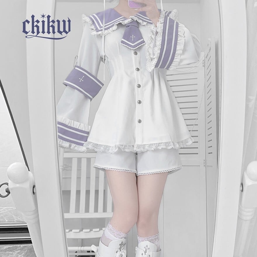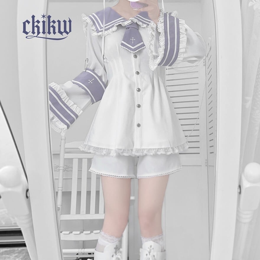 清潔感のあるセーラーデザインに、レースやフリルといった甘いディテールが加えられており、様々な雰囲気のロリータファッションに取り入れやすいアイテムです。特に、バイカラーのデザインが個性的で目を引きます。