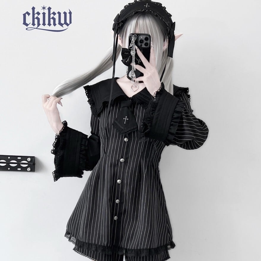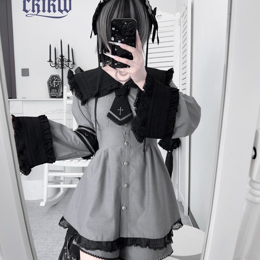 襟元のタイや、袖のラインに施されたクロスの刺繍やモチーフが、ゴシックまたはクラシカルなアクセントになっています。