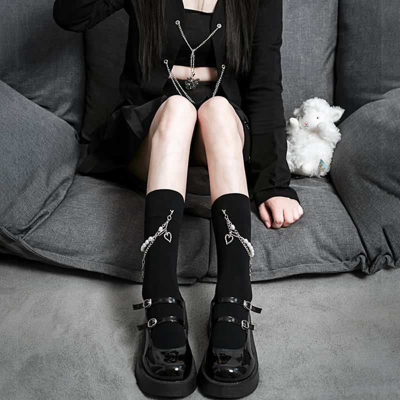 ゴスロリ 甘辛 ハイソックス フェイクパール チェーン