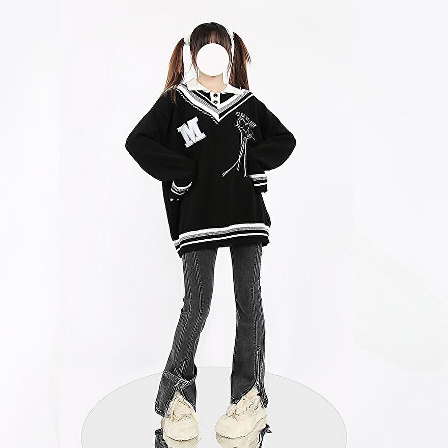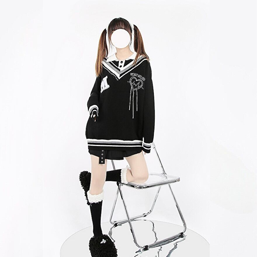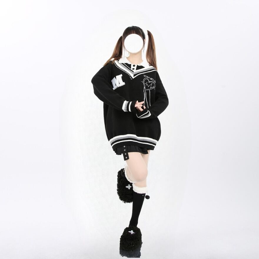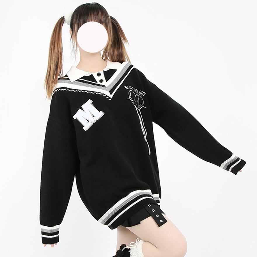 セミロリ ニット セーター セーラー風 フェイクツーピース 甘辛 Catwish JKロリータ 刺繍ロゴ
