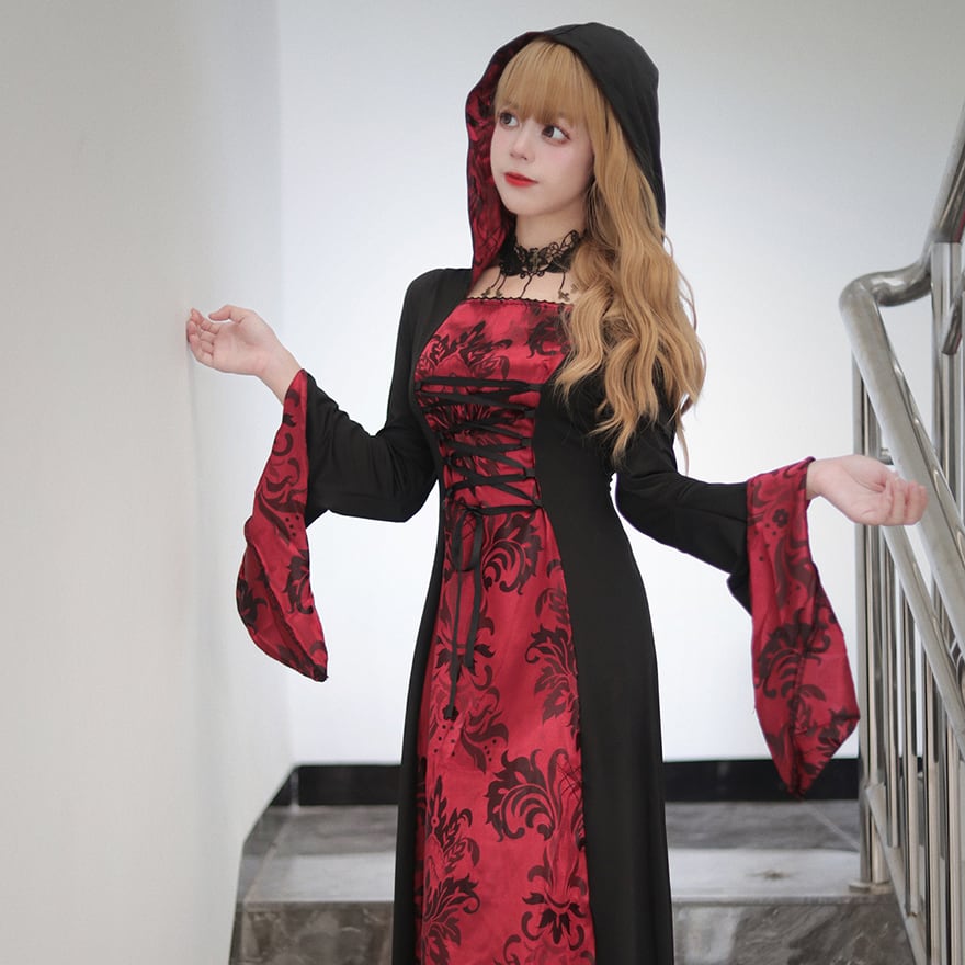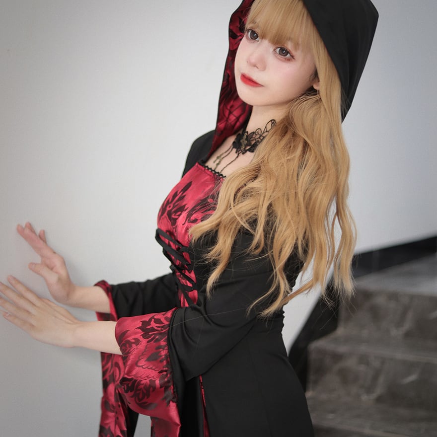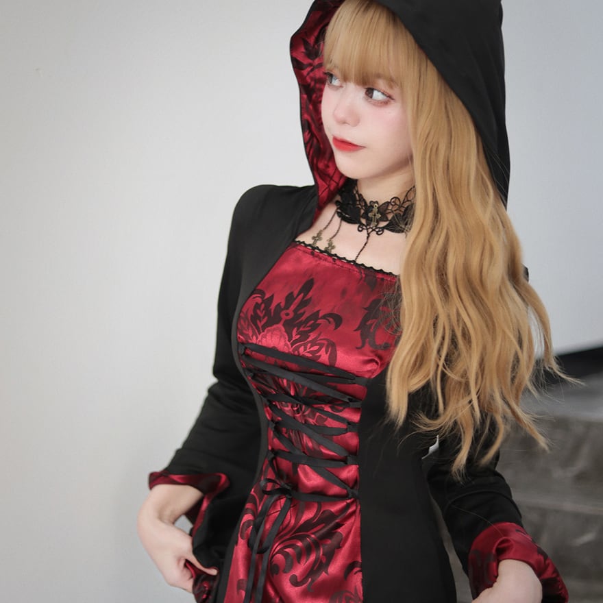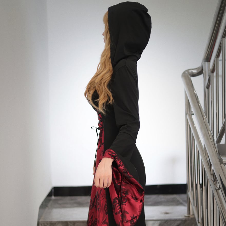 艶やかな深紅のダマスク柄生地と、シックなブラックを組み合わせた、フード付きのロングワンピースです。