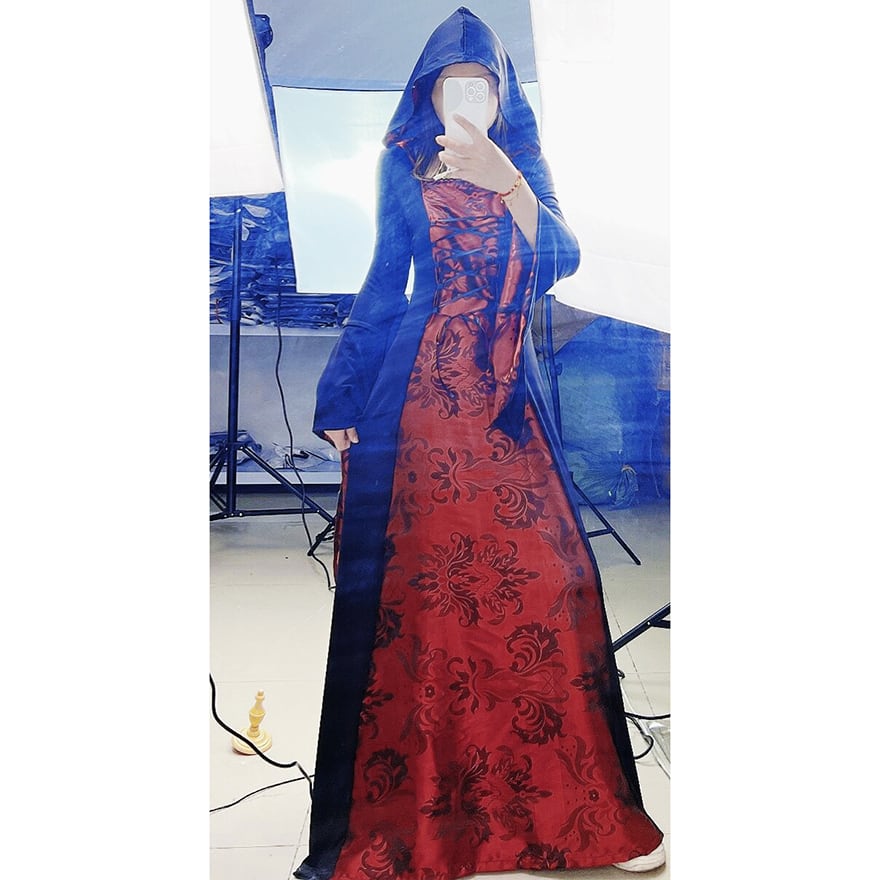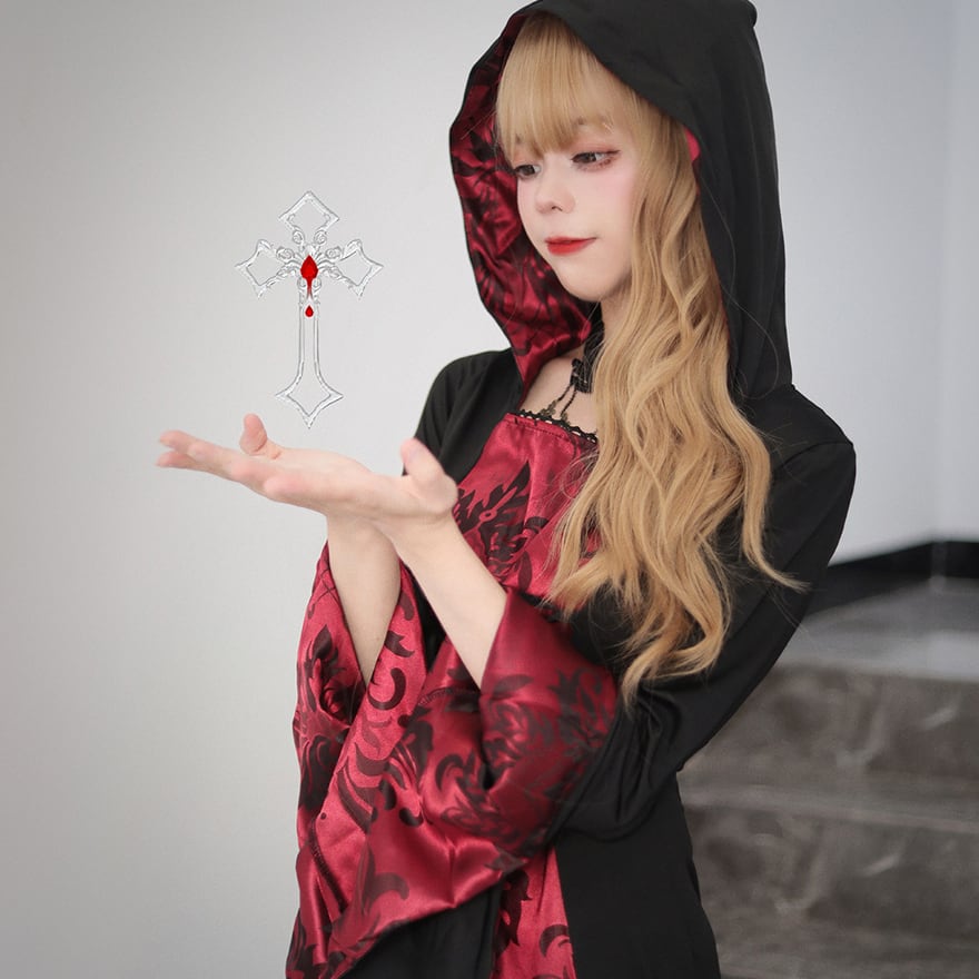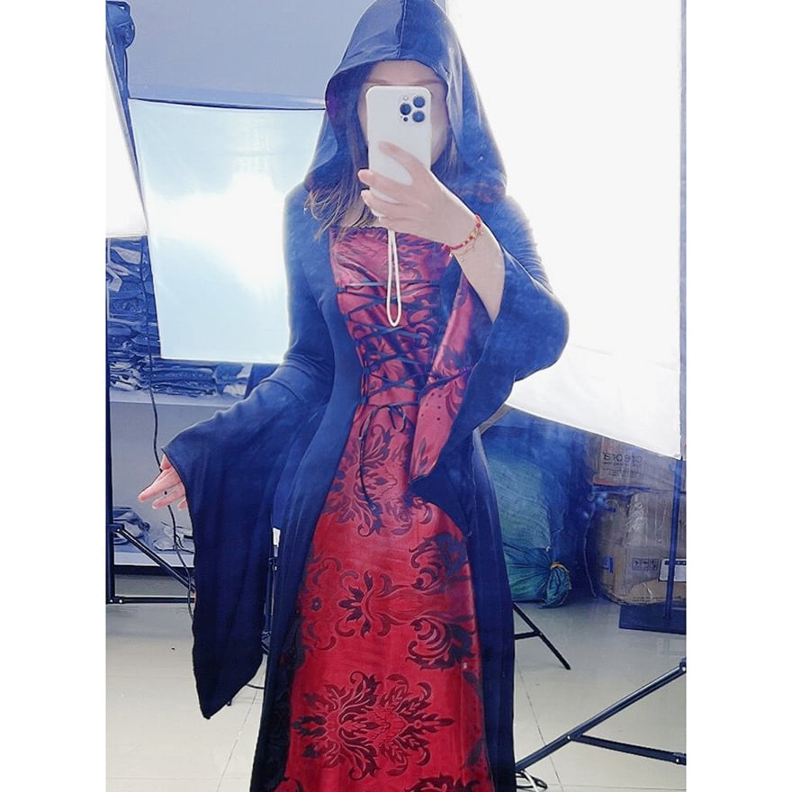 関連キーワード: #魔女 #コスチューム #ゴシック #ハロウィン #仮装 #コスプレ #ロングドレス #フード付き #ダークファンタジー #イベント #パーティー #個性的ファッション