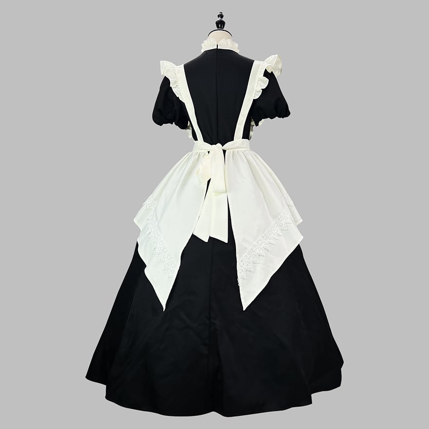 床まで届くロング丈の黒いワンピースに、清廉な白いエプロンを合わせた、ヴィクトリアン朝を彷彿とさせるクラシカルなメイド服です。