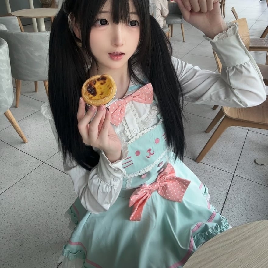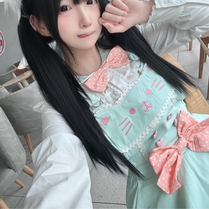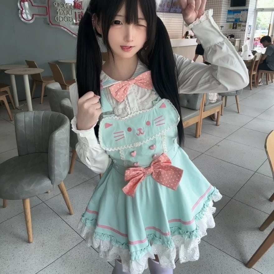 水玉リボンが可愛い丸襟シャツとニャンコ刺繍のジャンスカセットアップです。