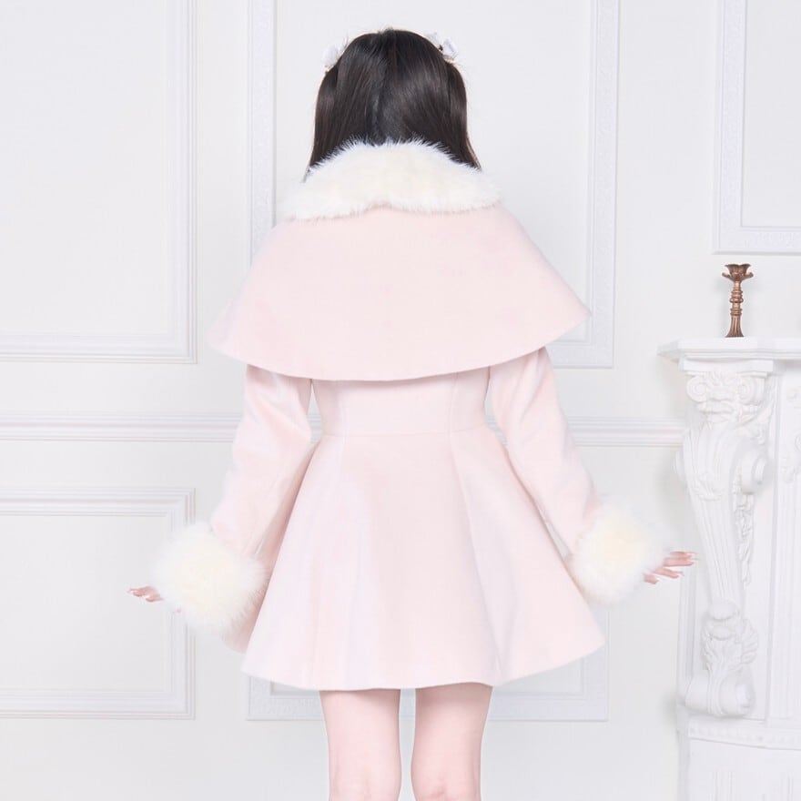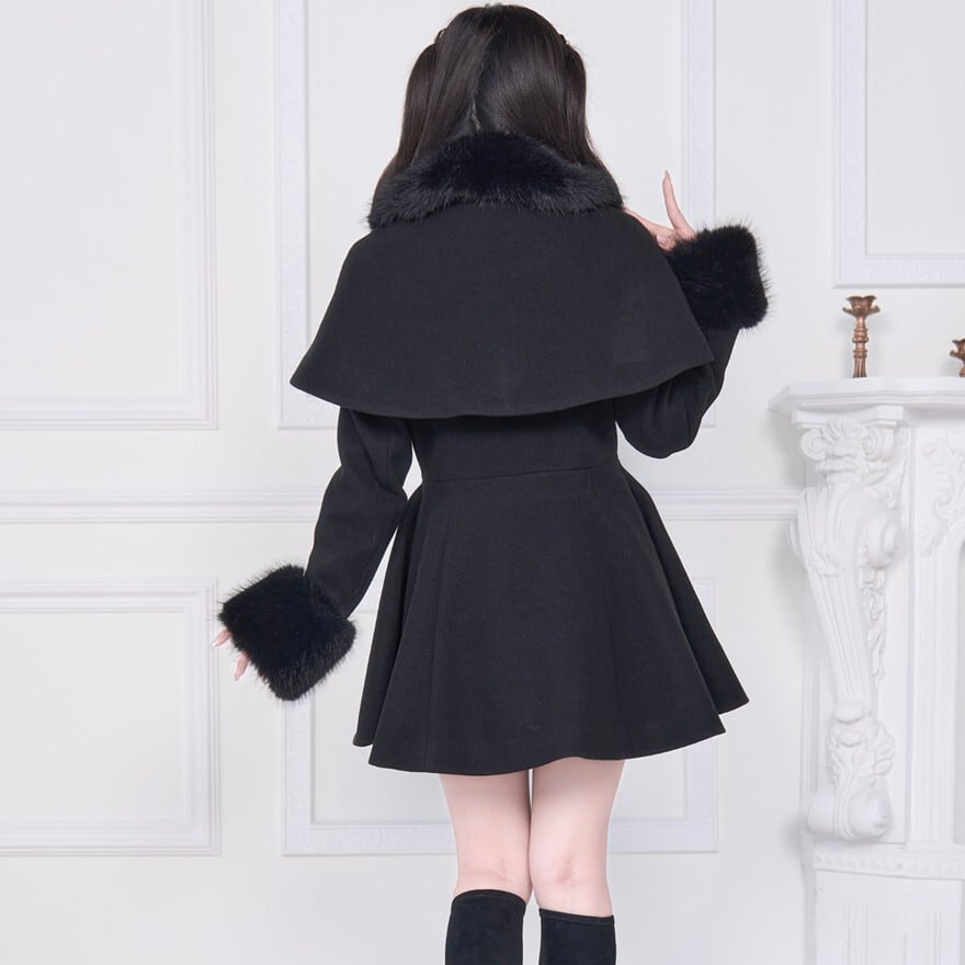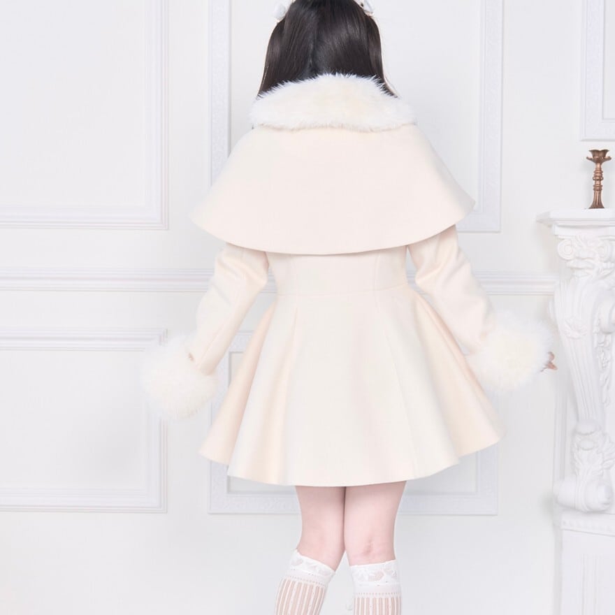 取り外し可能なファーの襟と、ふんわり広がるケープが特徴の、ロマンティックなクラシカルロリータコートです。