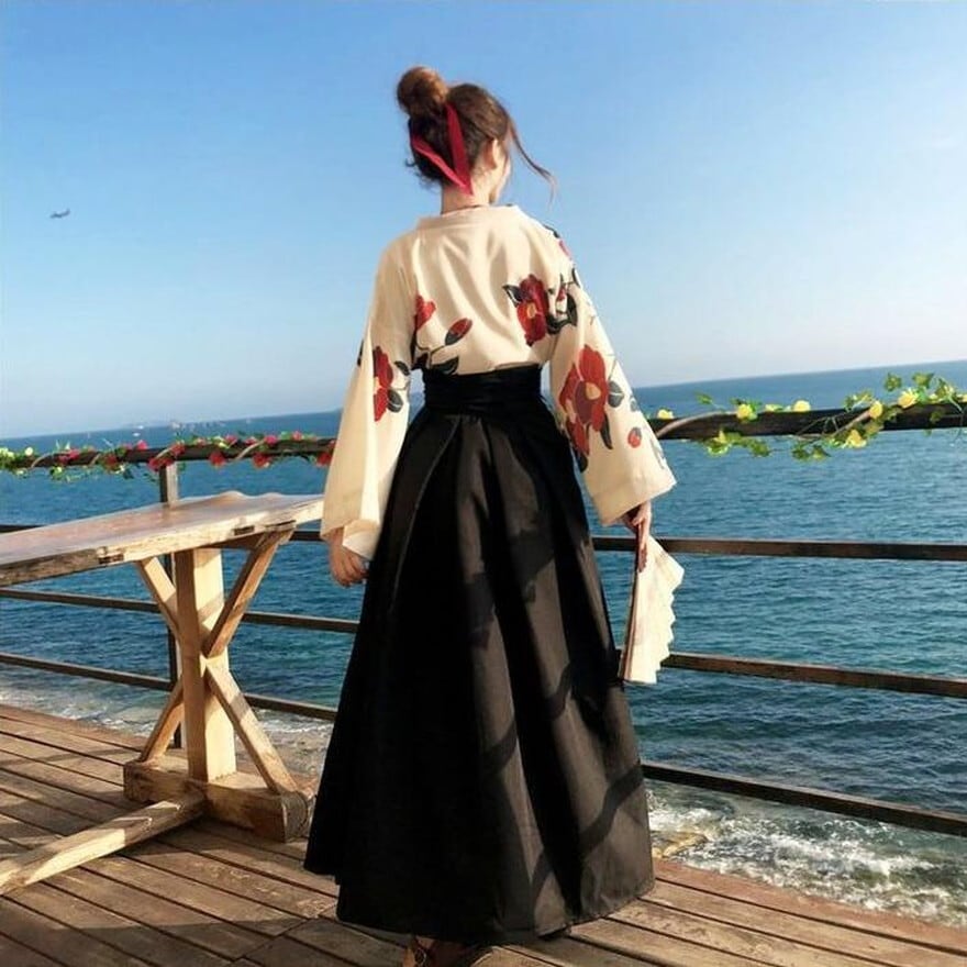 【国内発送】和装ロリィタ 着物 シャツ スカート ロング丈 花柄 カメリア