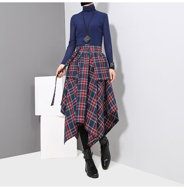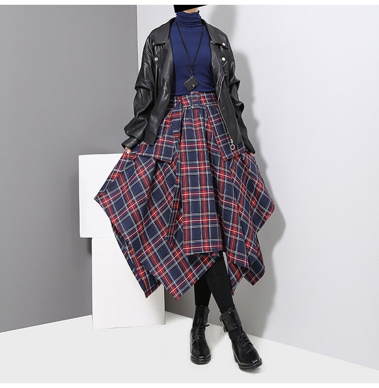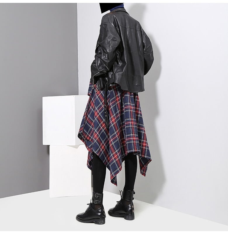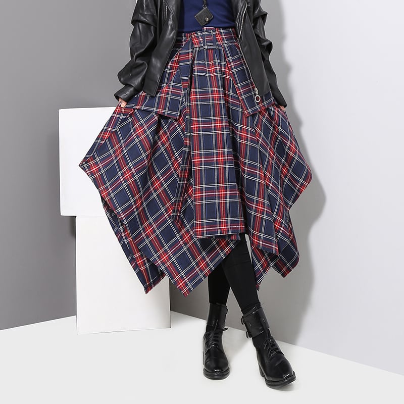 アラサーコーデにおすすめなチェック柄のアシンメトリーフレアスカートです。