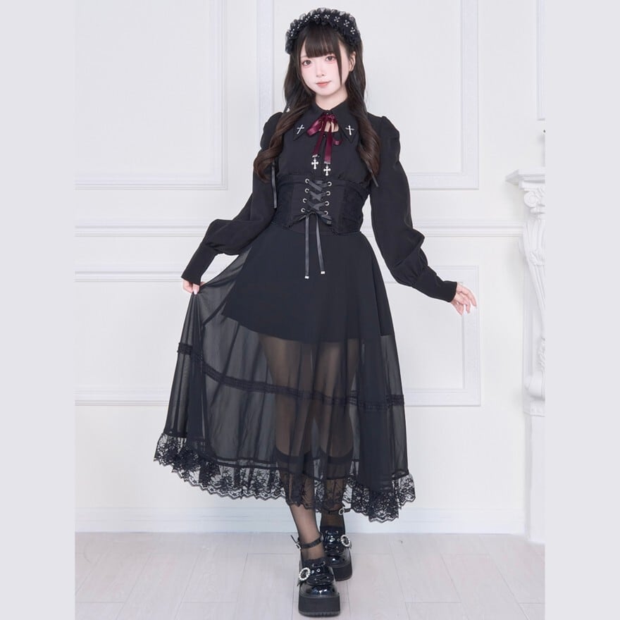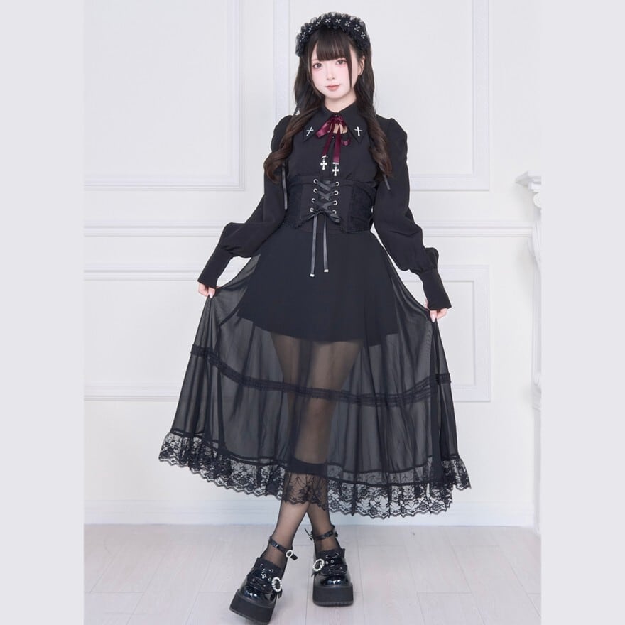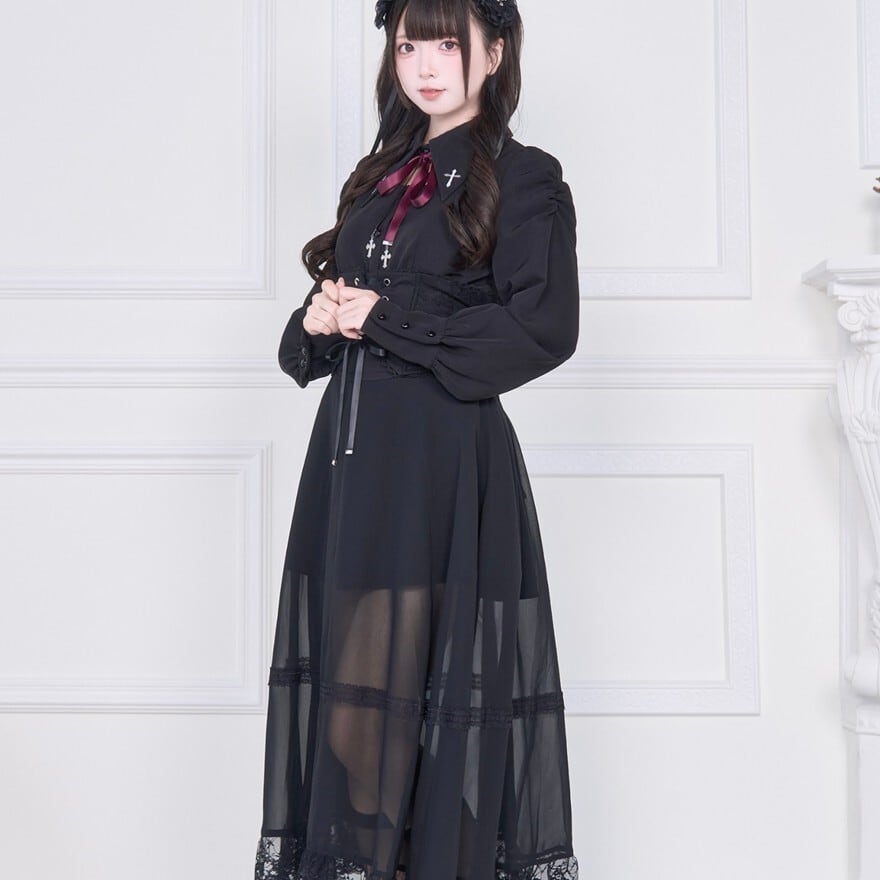 シックなブラックカラーとミステリアスな十字架、そしてシアー素材のロング丈が、大人っぽく洗練されたゴシックロリータスタイルを叶えます。