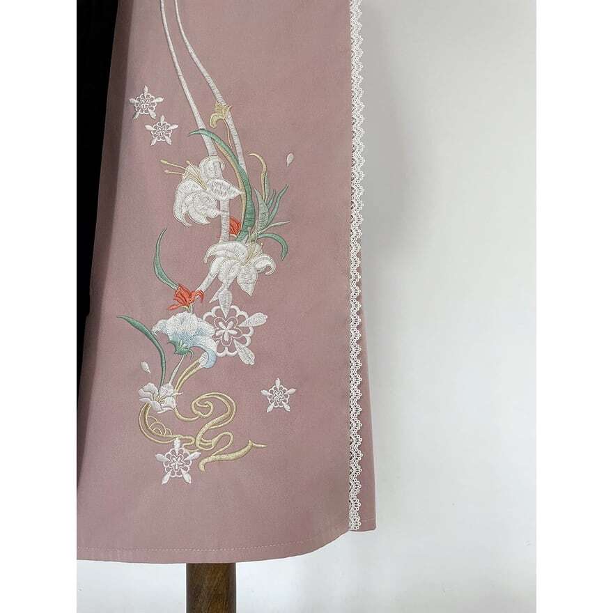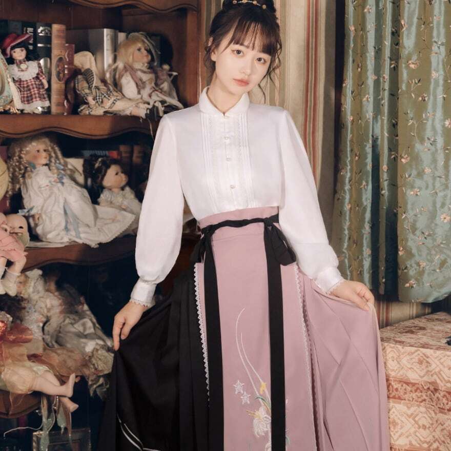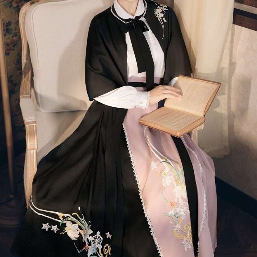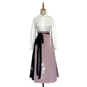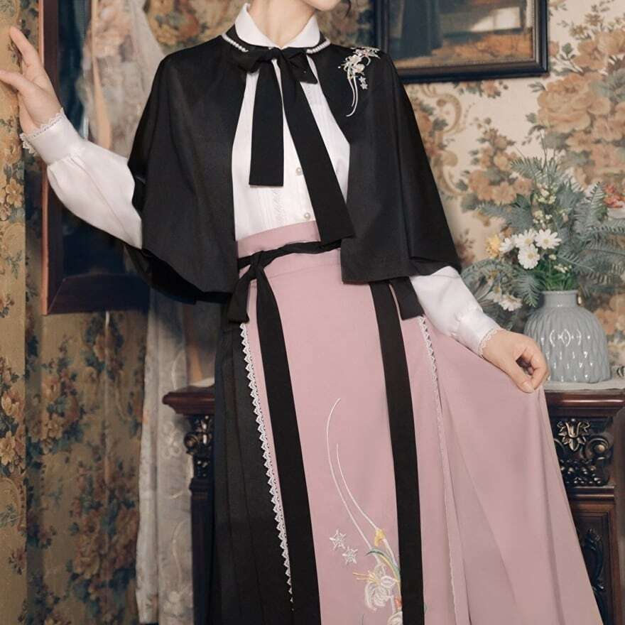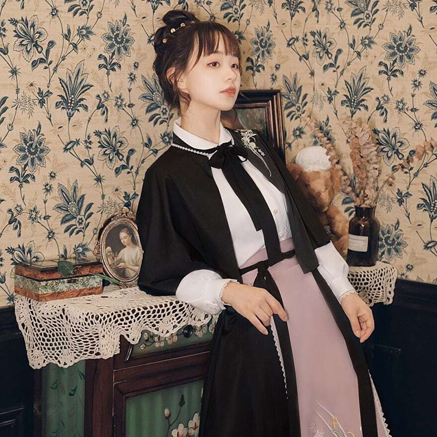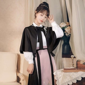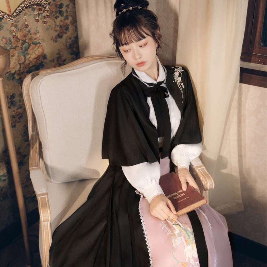 クラシカルな白のブラウス、淡いピンクと黒の切り替えが美しいロングスカート、そしてショート丈のケープがセットになった、中華風テイストの3点セットアップです。特にスカートに施された繊細な花刺繍と、ケープの首元にあしらわれた大きなリボンが、品格と可愛らしさを両立させます。和風や中華ロリィタの要素を取り入れた、新しいクラシカルスタイルを提案します。
