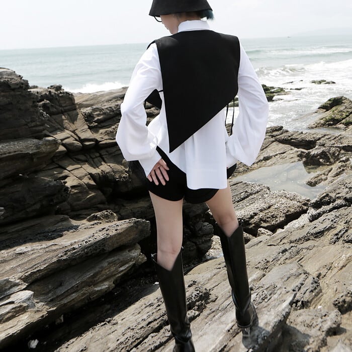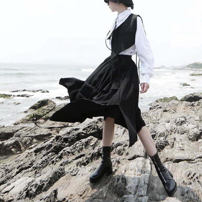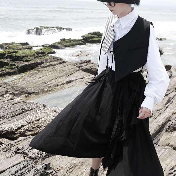 「知的な優雅さ。クラシカルなディテールで魅せる黒のベスト。」 黒の生地をベースに、フロントにダブルベルトの装飾と、縦に並んだボタンが特徴的なベスト(ジレ)です。ジャケットのようなシャープな襟(ノッチドラペル)と、ウエストを絞ったデザインが、着る人に洗練されたクラシカルゴシックな雰囲気を与えます。少年装やモード系の着こなしに欠かせない、主役級のアイテムです。