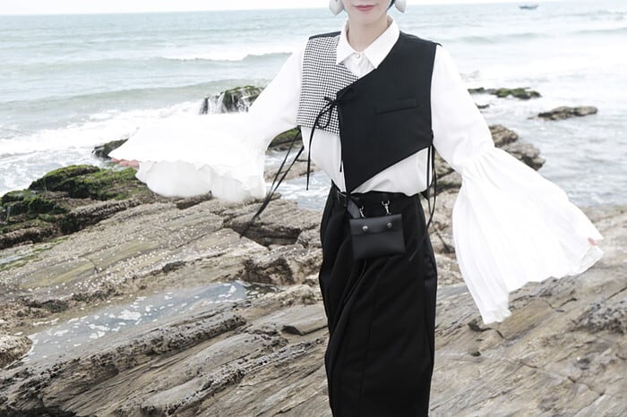 このベストの魅力は、その構築的なデザインとクラシカルな装飾です。 ベルト装飾: 左右非対称に配置されたダブルベルトが、デザインのアクセントとなり、視覚的な面白さをプラスします。