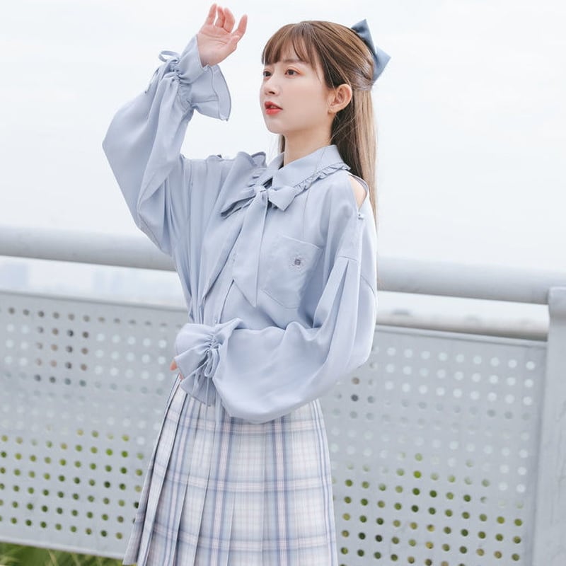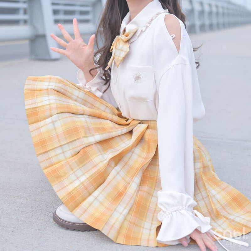 淡いパステルカラーの甘めブラウス、チェック柄プリーツミニスカと相性ばっちり