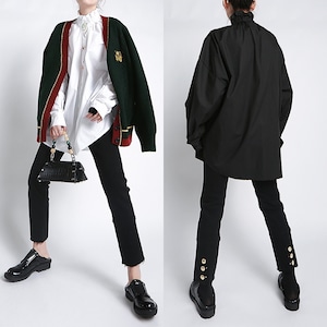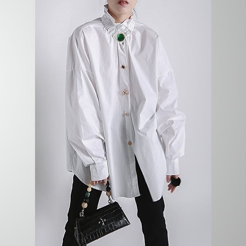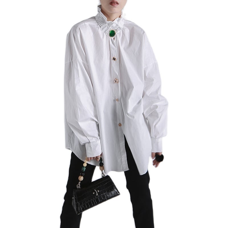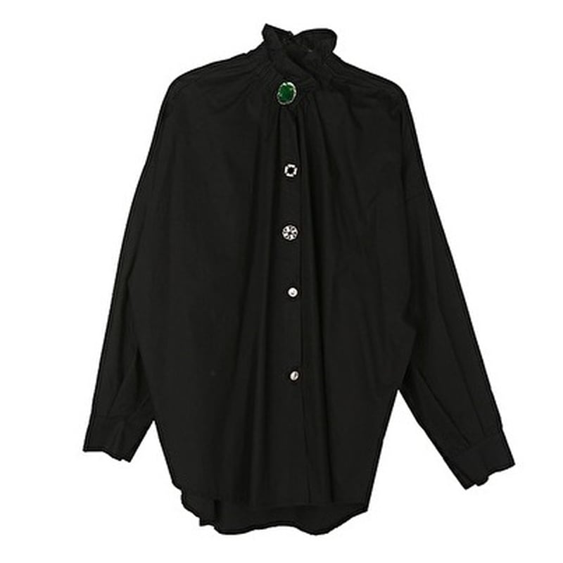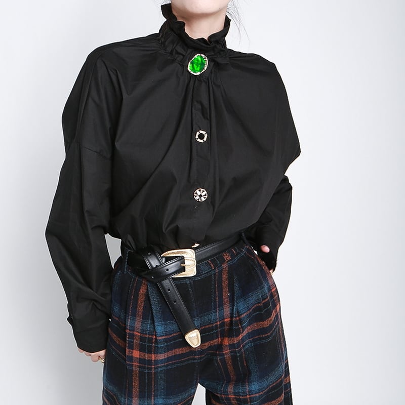 ロマンティックでありながらも、モードな強さを秘めたブラックのブラウスです。首元は甘すぎないフリル(ラッフル)ハイネックで、レディな雰囲気を演出。セットで付属する、エメラルドグリーンの大粒な宝石風ブローチが、まるで貴族の秘宝のように首元でミステリアスな輝きを放ちます。