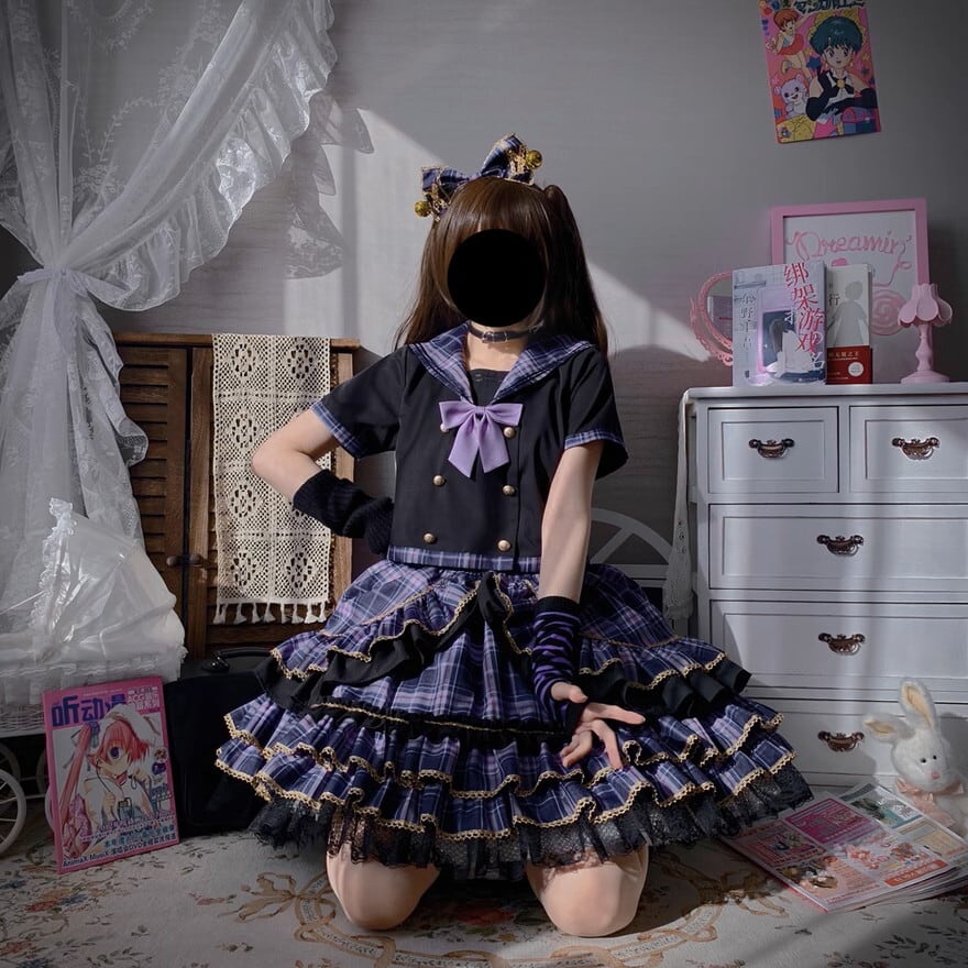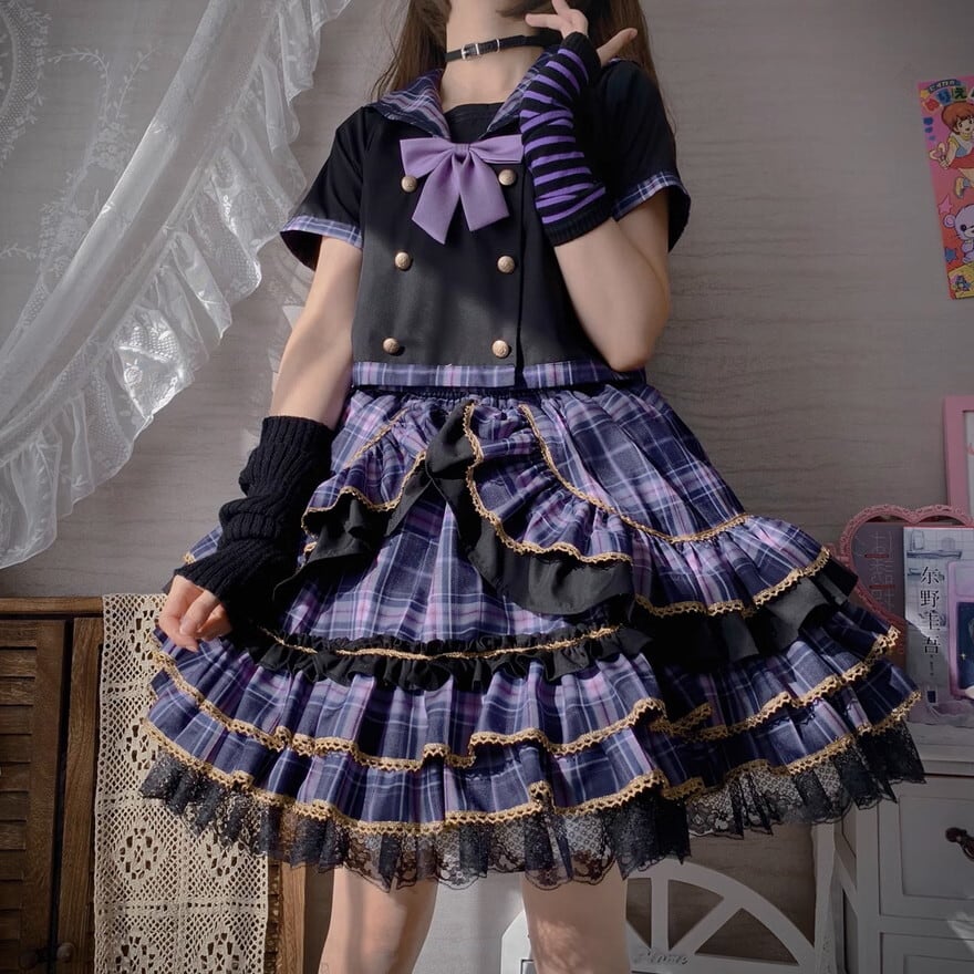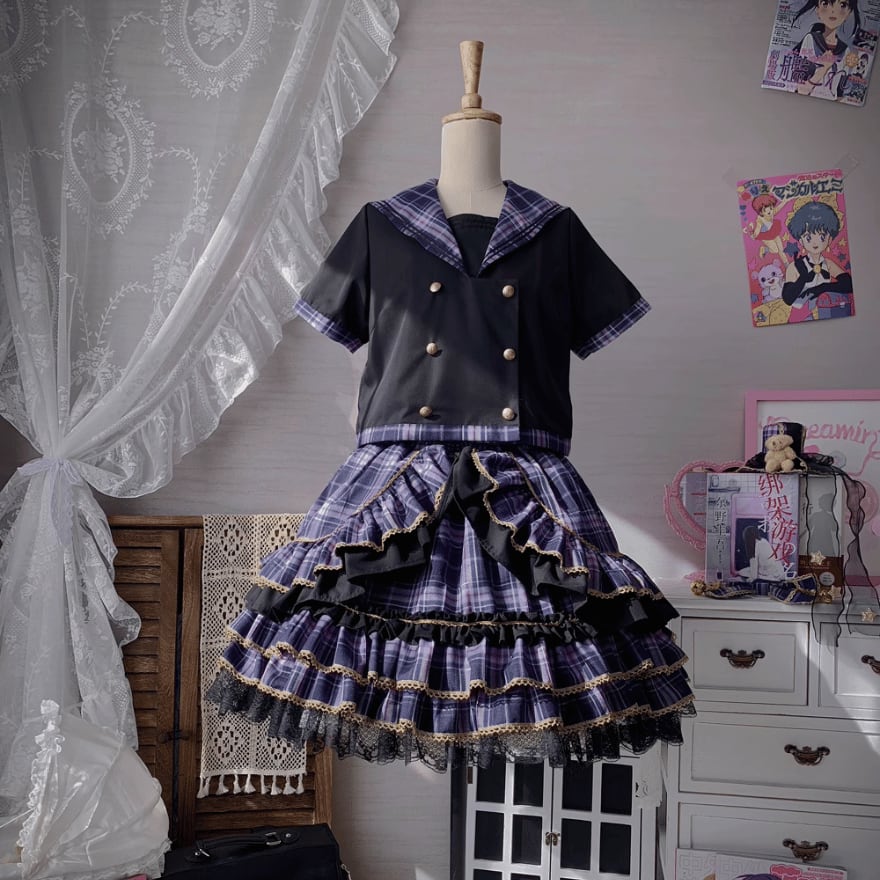 アイドル、ステージ衣装のチェック柄スカートにコーデする半袖セーラー服です。