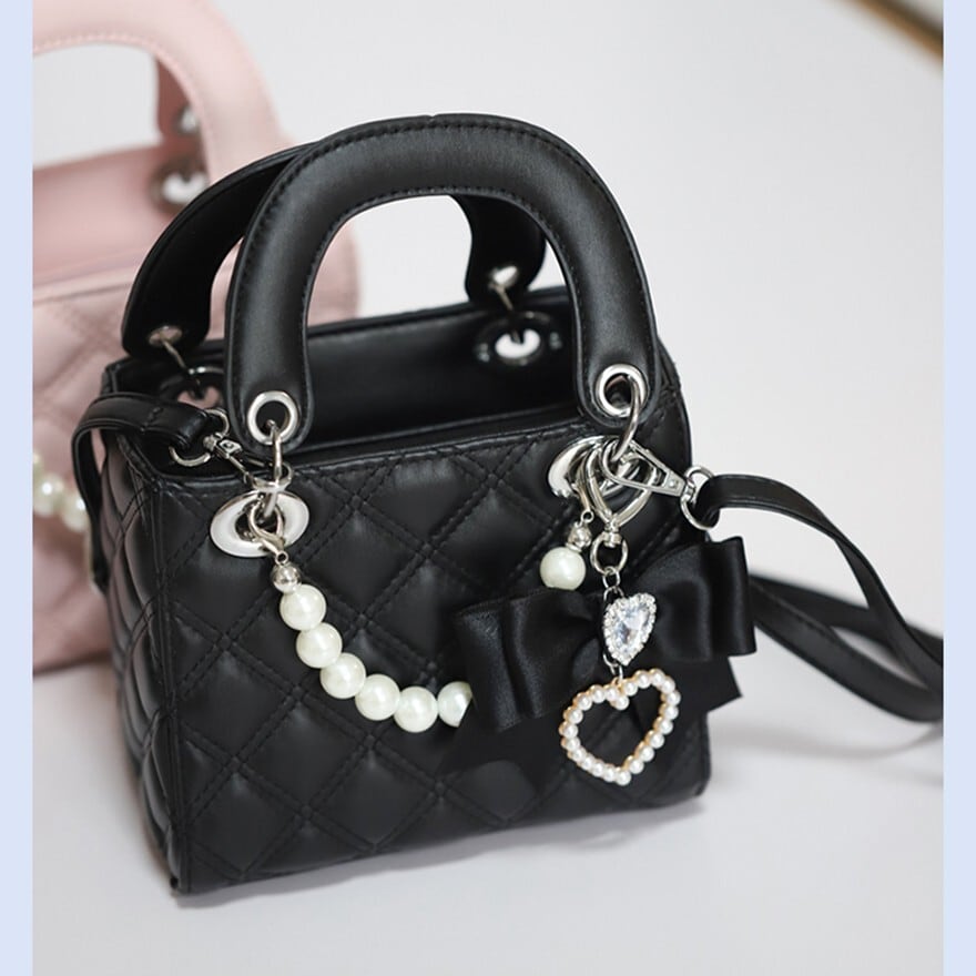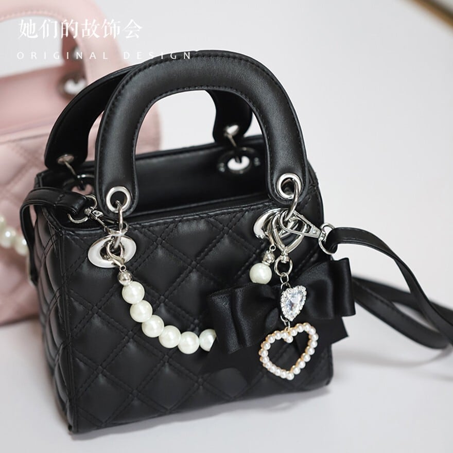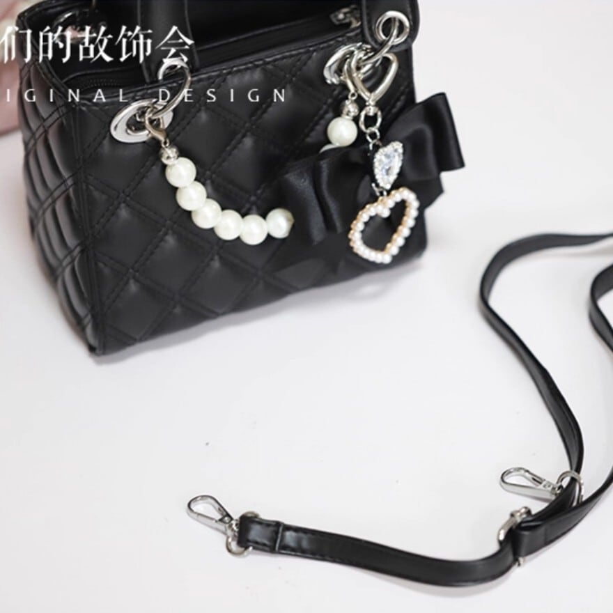 特筆すべきは、付属のチャームです。大きな黒いリボン、パールを連ねたチェーン、そしてラインストーンとパールで装飾されたハートのモチーフが、バッグにドーリーで華やかな魅力を添えています。