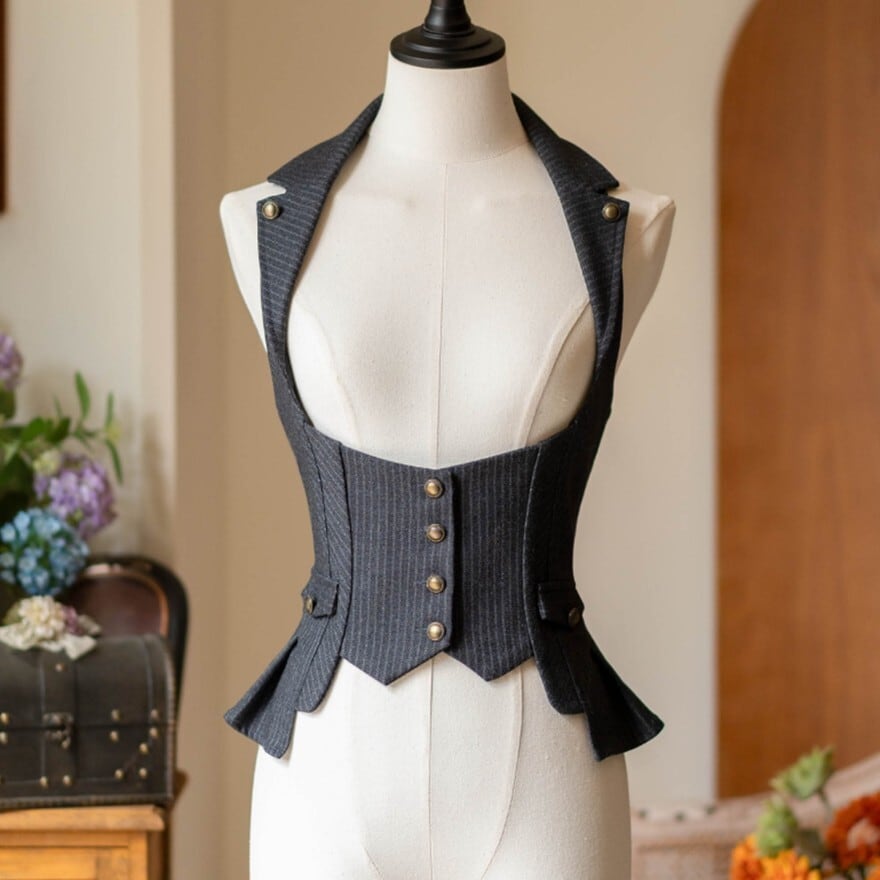 コルセット風のデザインがウエストを美しく見せる、クラシカルなビスチェベストです。