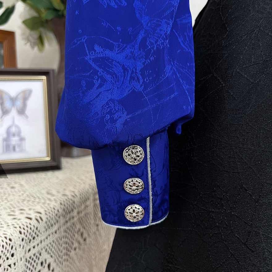 鮮やかなロイヤルブルーのシャツに、シックなブラックのベストとアシンメトリーデザインのボトムスを合わせた、騎士や王子を彷彿とさせるセットアップです。