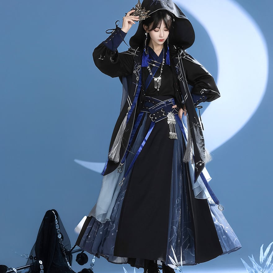 夜空のような深い黒と青のグラデーションが美しい、フード付きのマント、トップス、スカート、ベルト、そしてネックレスまで揃った豪華なセットアップです。