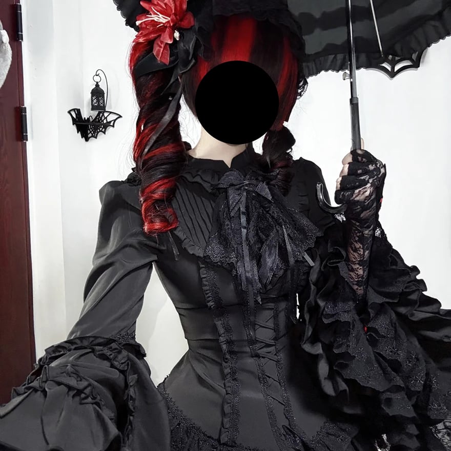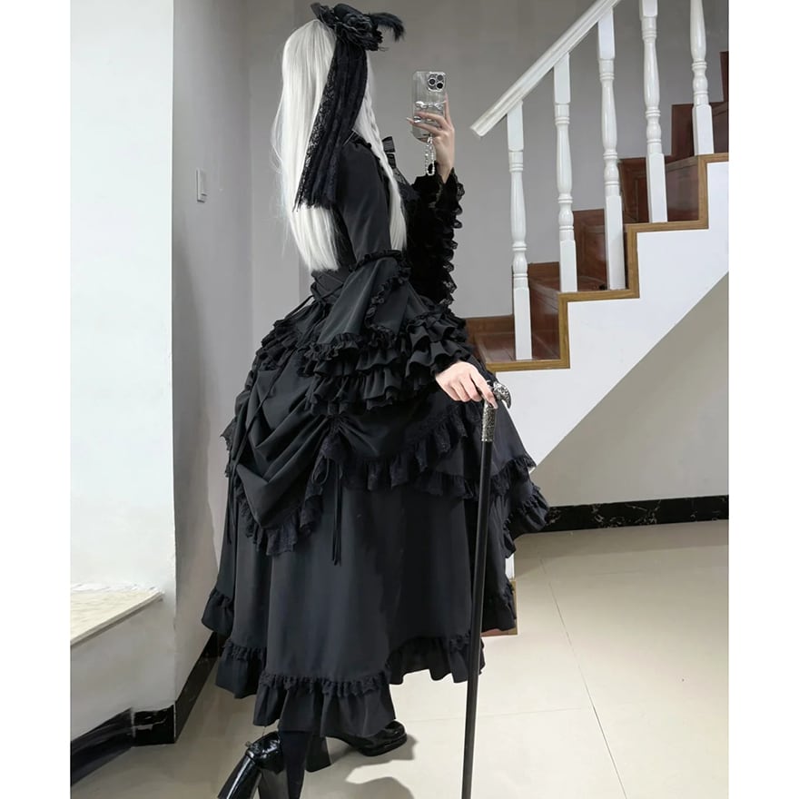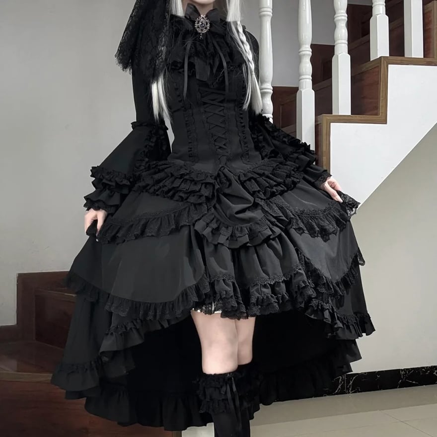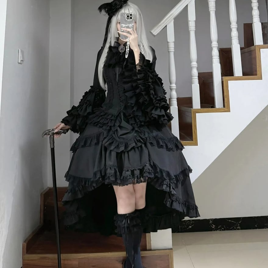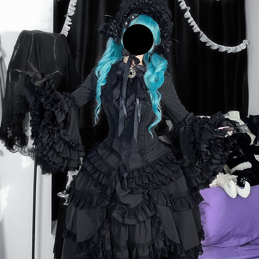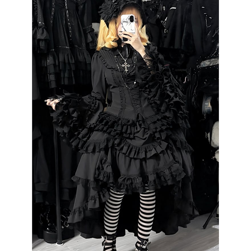 漆黒の生地がフリルの陰影を深く際立たせ、重厚感のあるダークな世界観を創り出します。