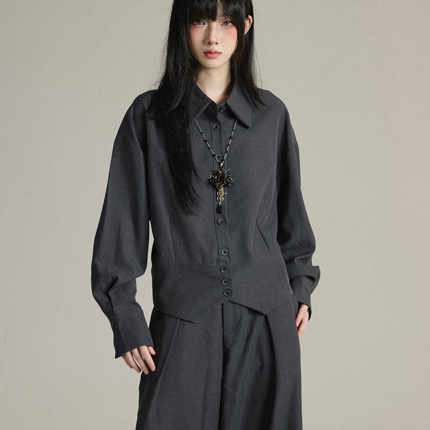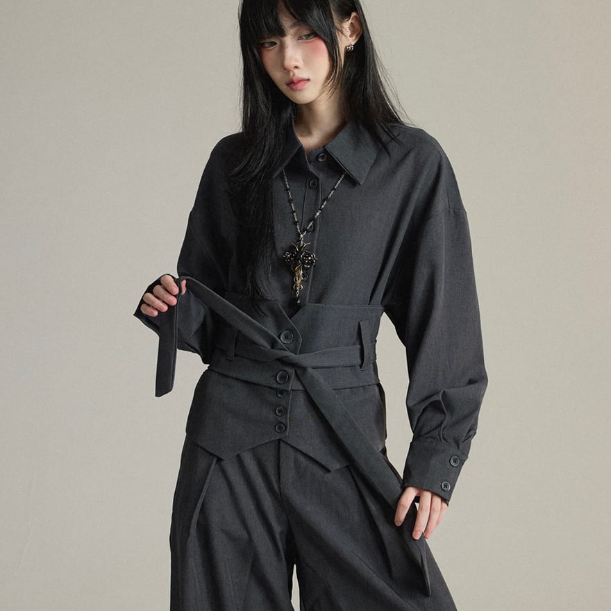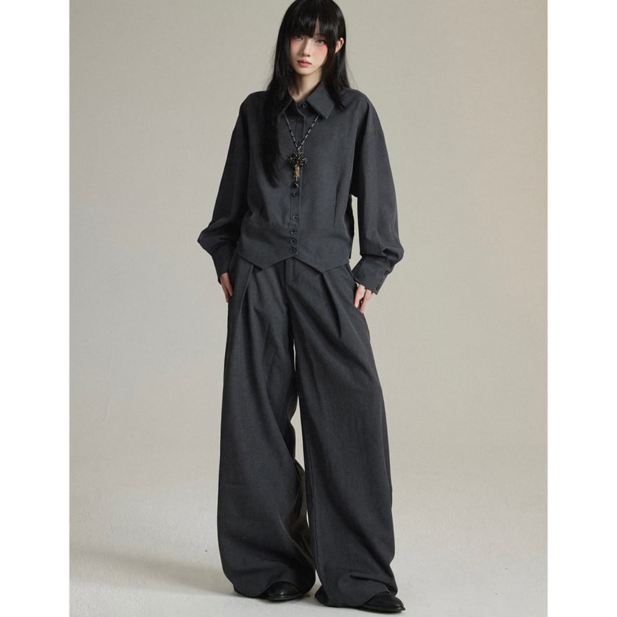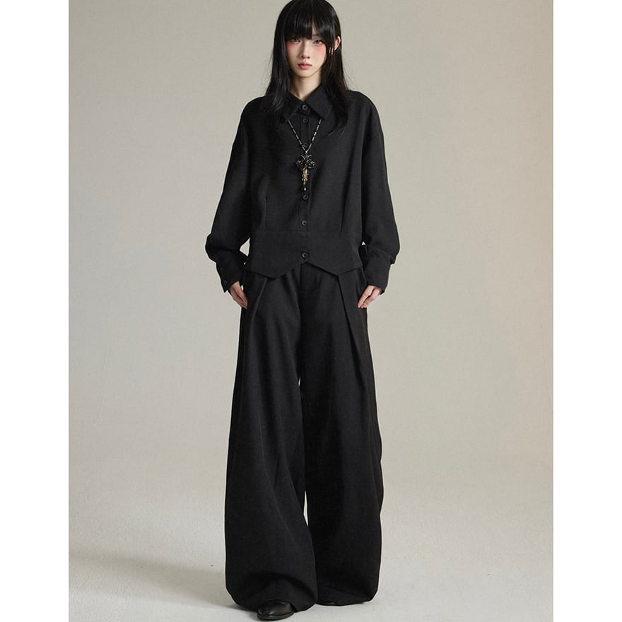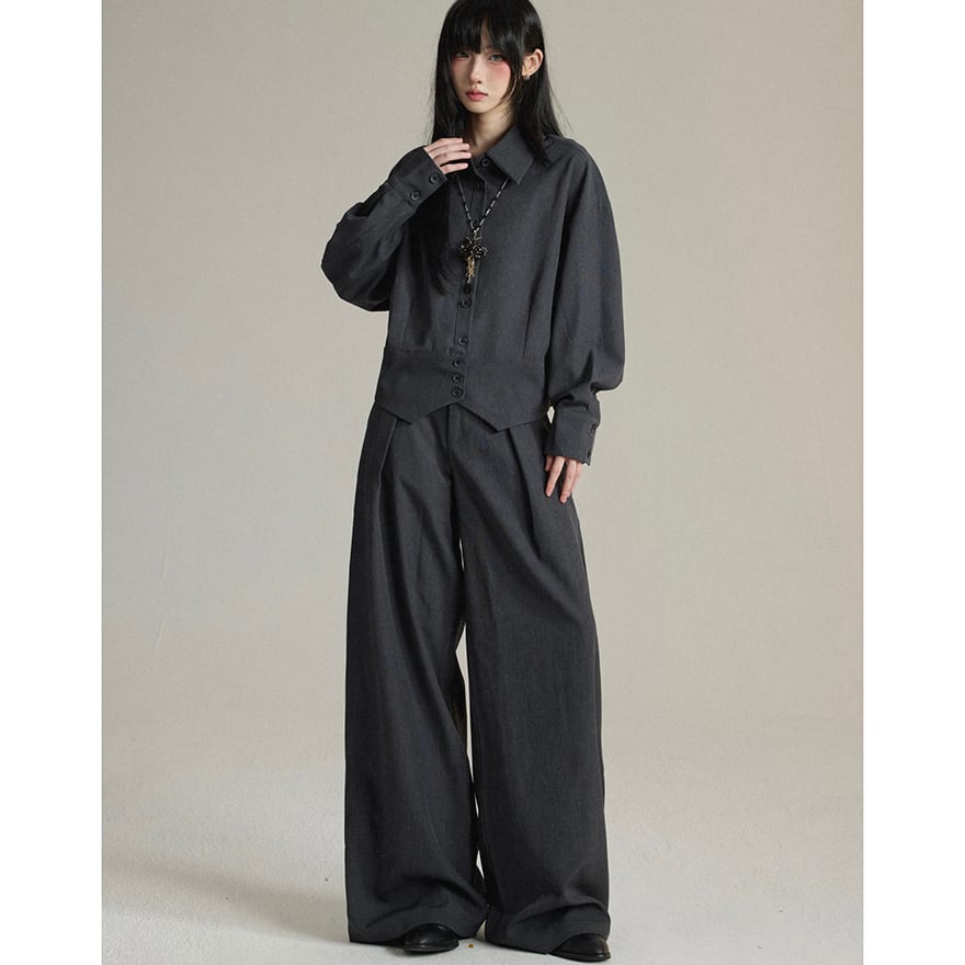 シャツにベストを重ねたようなドッキングデザインのトップスと、スカートのように見えるワイドパンツのセットアップです。