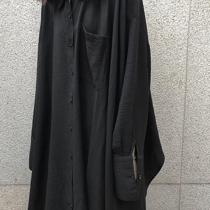 ゆったりした大きめサイズのアシンメトリーな病みかわいいシャツワンピです。闇深いブラックに大き目なゆったりとしたシルエットが美しい病みかわワンピです。
