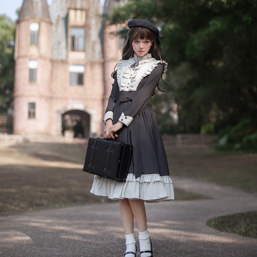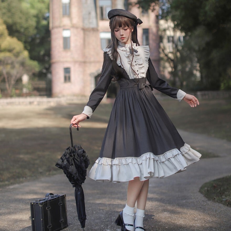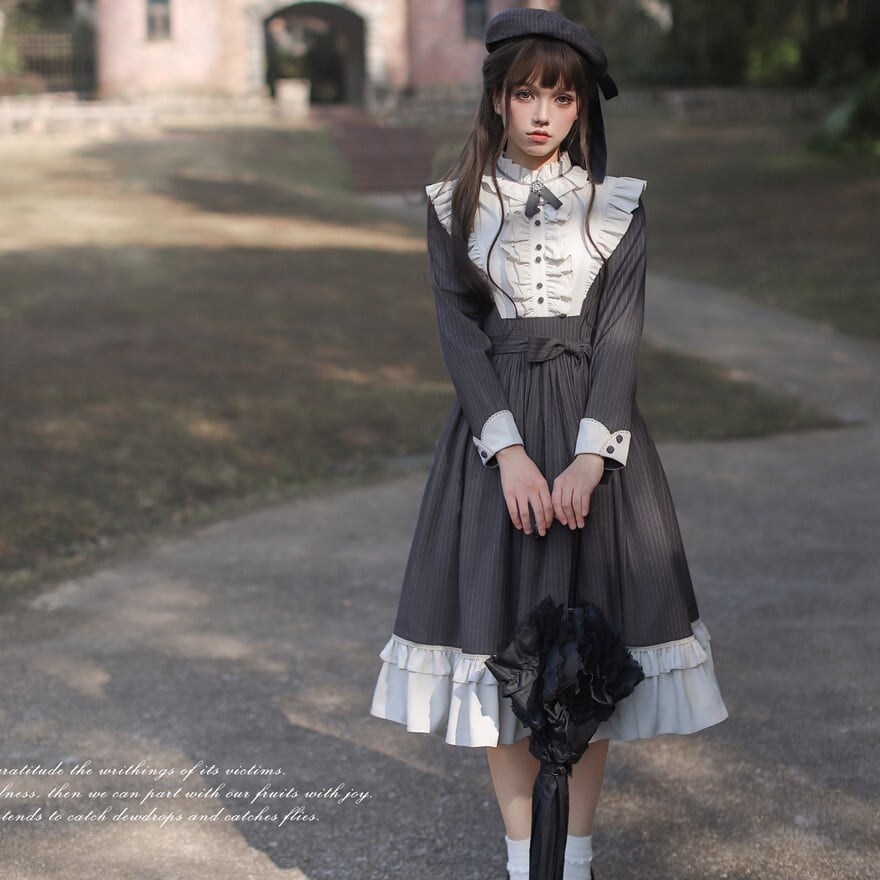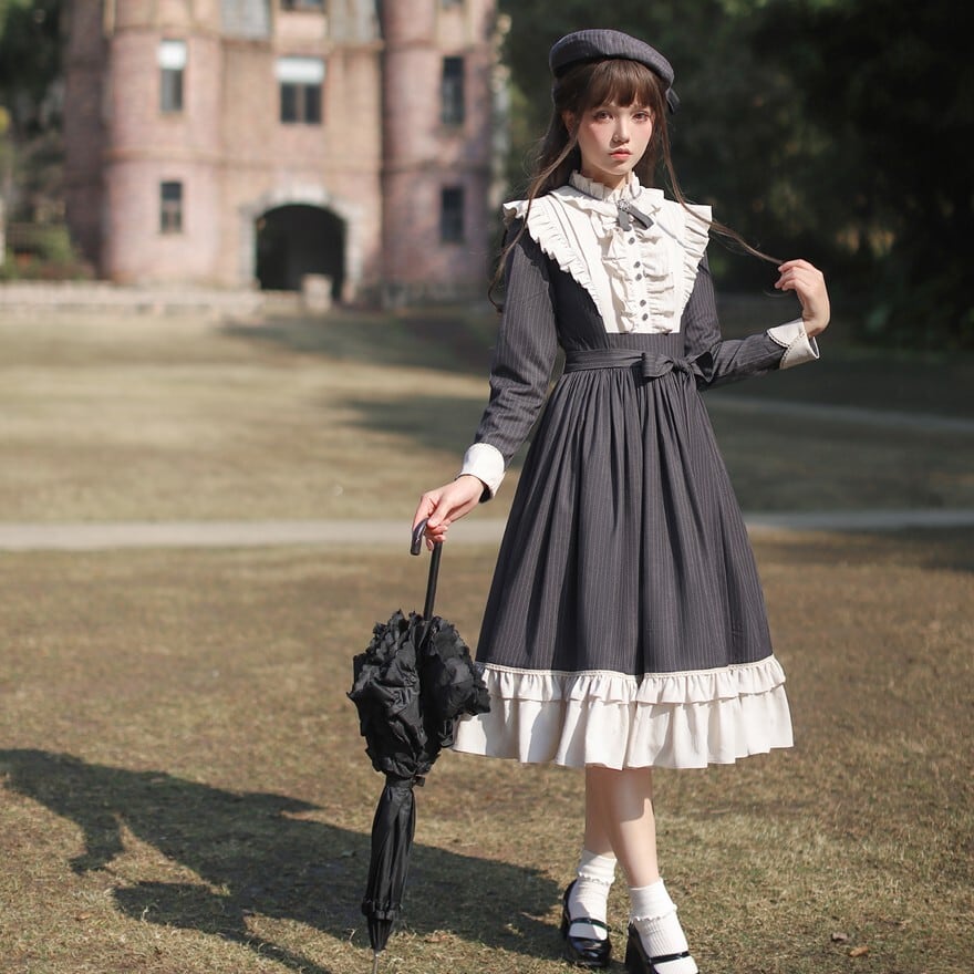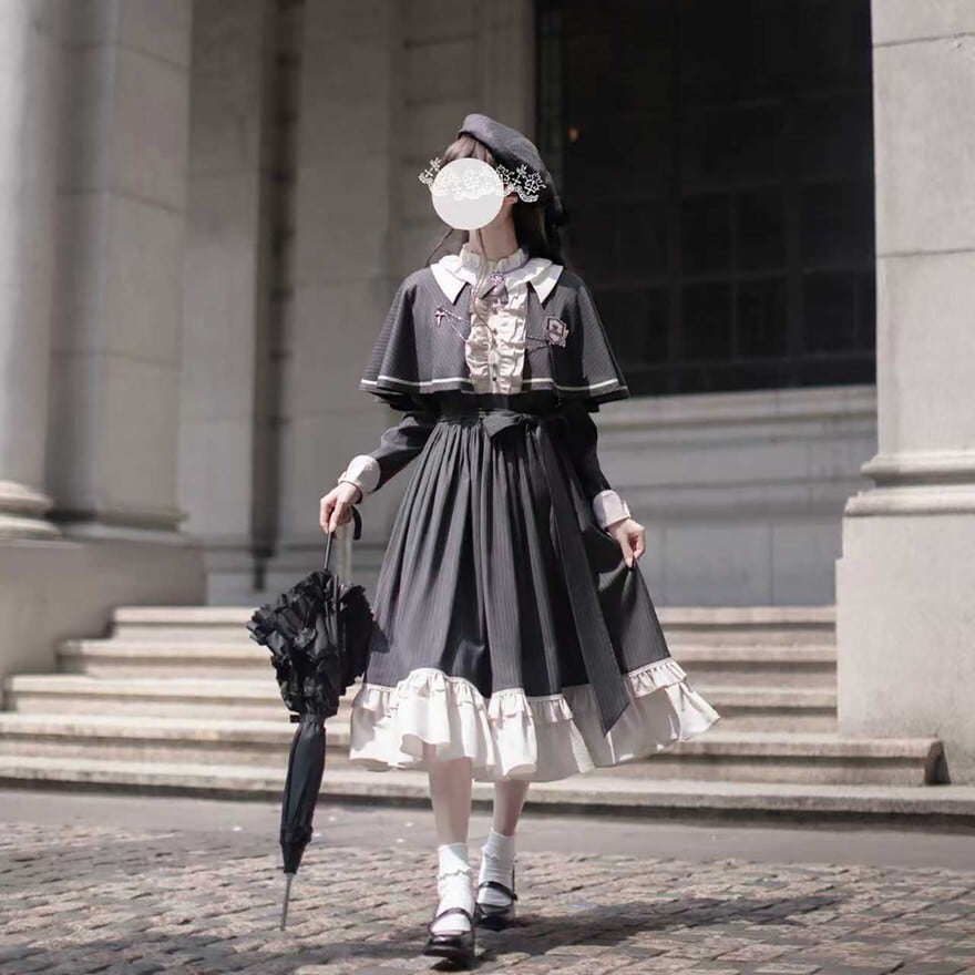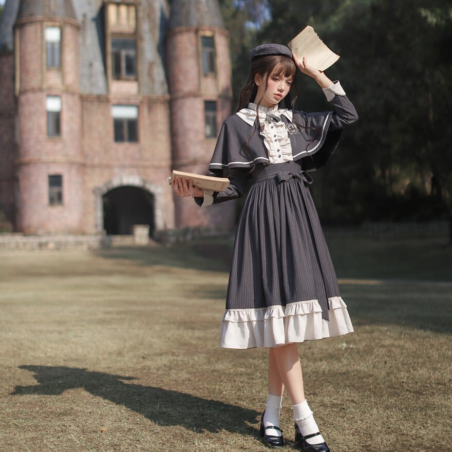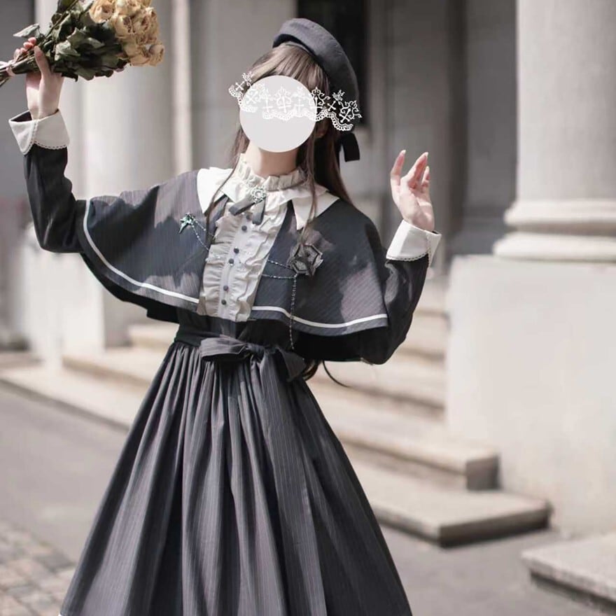 量産型 クラシカルロリィタ セットアップ ケープ ワンピース 蝶ネクタイ付き ストライプ柄 女学園風 控えめ 胡桃木