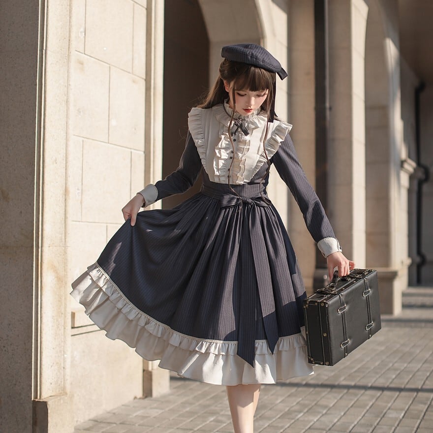 紺色ストライプ柄の生地に、オフホワイトの繊細なレースやフリルが襟元、袖、裾にあしらわれた、クラシカルロリータのワンピースです。