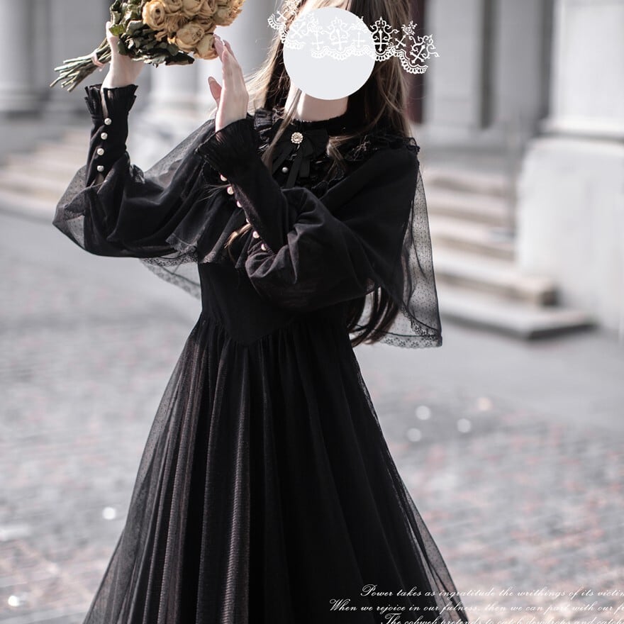 漆黒のドットチュール生地に、繊細なレースやフリルが襟元、袖、裾にふんだんにあしらわれた、クラシカルロリータのワンピースです。